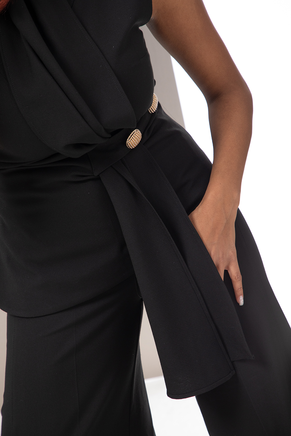 Елегантен асиметричен топ в черно от приятна еластична материя. Втален силует с едно рамо и шал яка, която преминава отпред, декоративен колан със златисти копчета. Странично закопчаване посредством цип. Моделът е изработен с подплата.