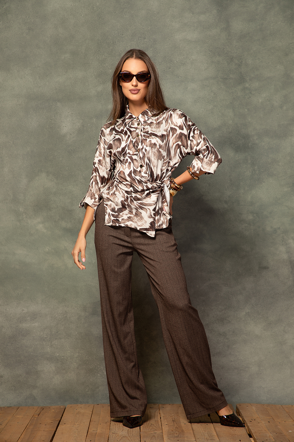 Елегантна риза от приятна вискоза в животински принт в кафявата гама. Леко втален силует с интересно асиметрично връзване в предната част. Закопчаване посредством пластрон с тик так копчета. 7/8 ръкав с маншет и щрифелка, цепки встрани.