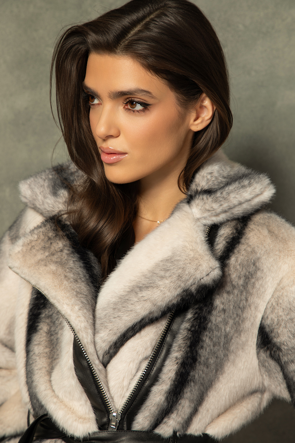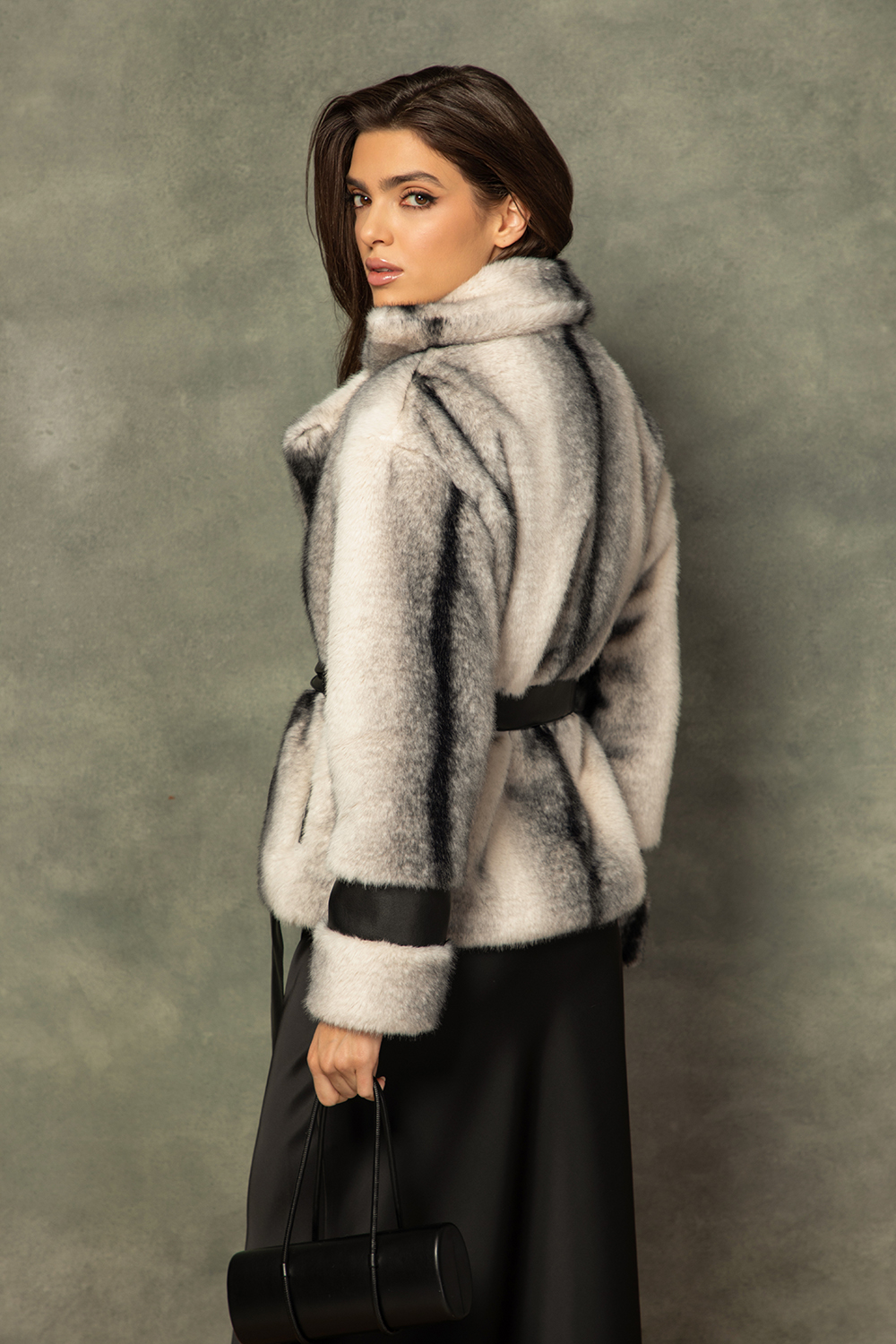 Елегантно асиметрично палто от красив еко косъм в преливащо сиво и бежово. Закопчаване посредством цип и ревер. Подвижен колан от черна еко кожа. Предни джобове и подплата.