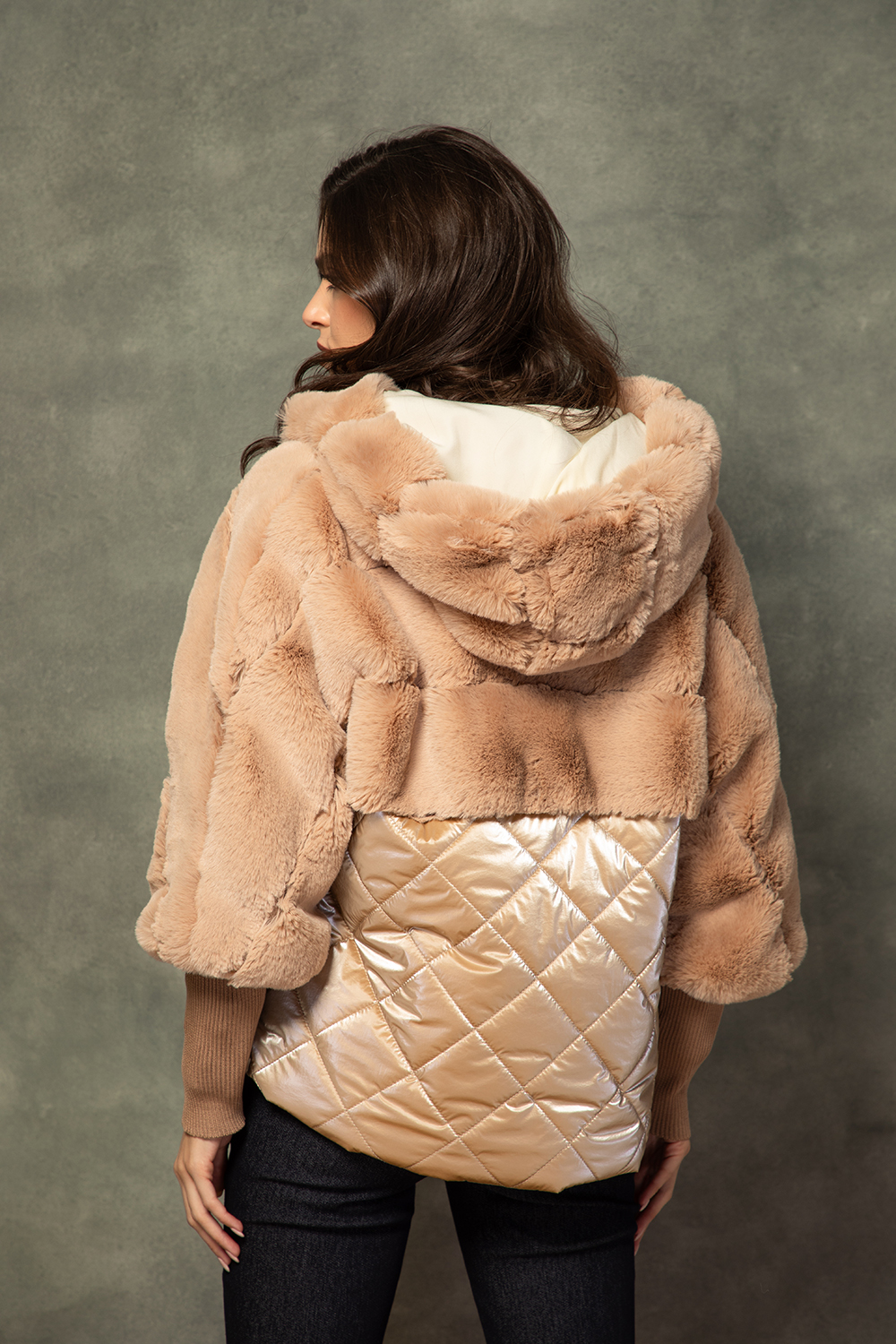 Шикозно и интересно яке, изработено от луксозна материя с мек къс косъм в карамелено и капитонирана промазка в златисто. Свободен силует с прилеп ръкав и закопчаване посредством метален цип. Дълъг ръкав с висок маншет от щрик, външни джобове и качулка. Якето е подплатено с топъл пухкав полар в бяло. Комфортен и модерен зимен стил.