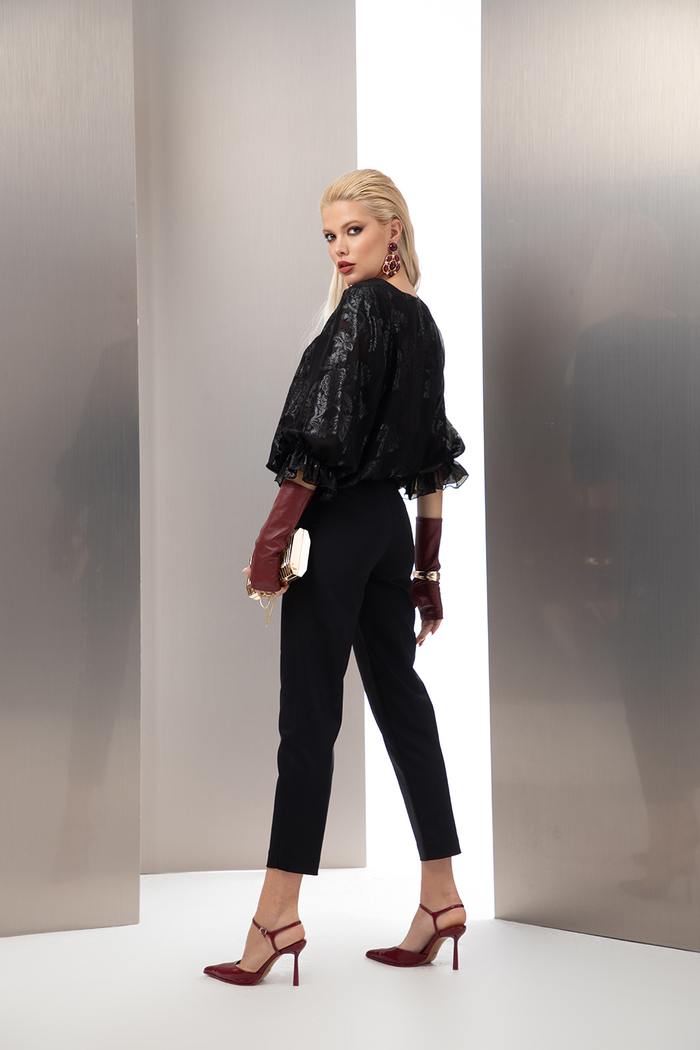 Елегантен бизнес панталон в черно от приятна еластична материя с високо съдържание на памук. Втален силует с акцентен детайл встрани у двойни гайки за колан. Предно закопчаване посредством цип и копче.