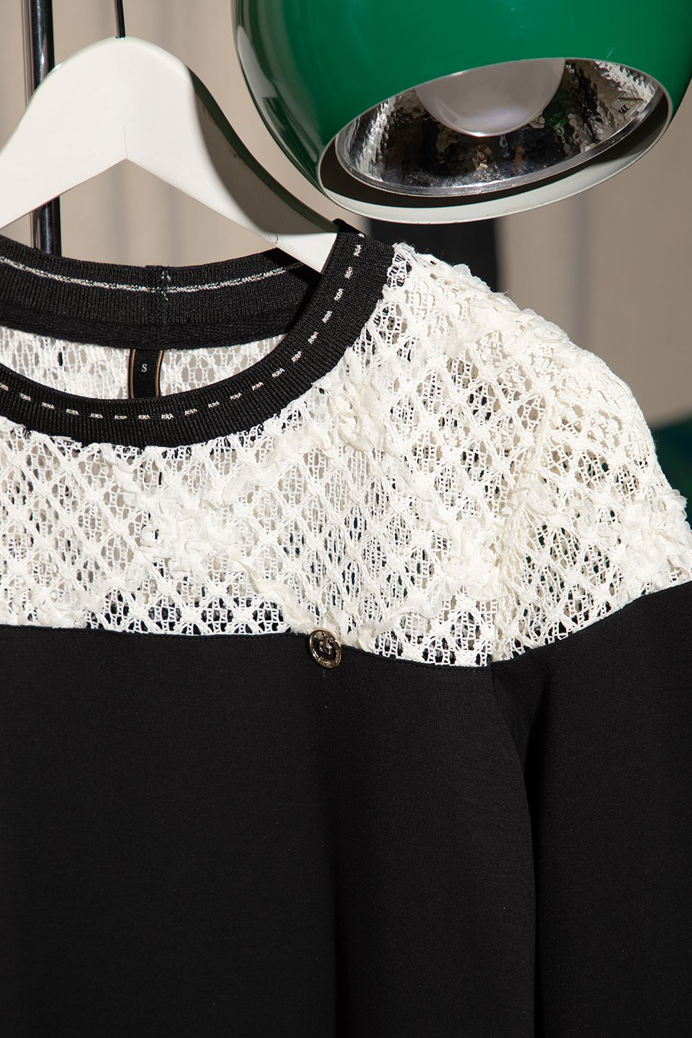 Свежа спортно-елагантана блуза в черно от приятна еластична материя. Леко свободен силует с обло деколте и къс ръкав. Ефектна платка от бяла дантела в горната част.