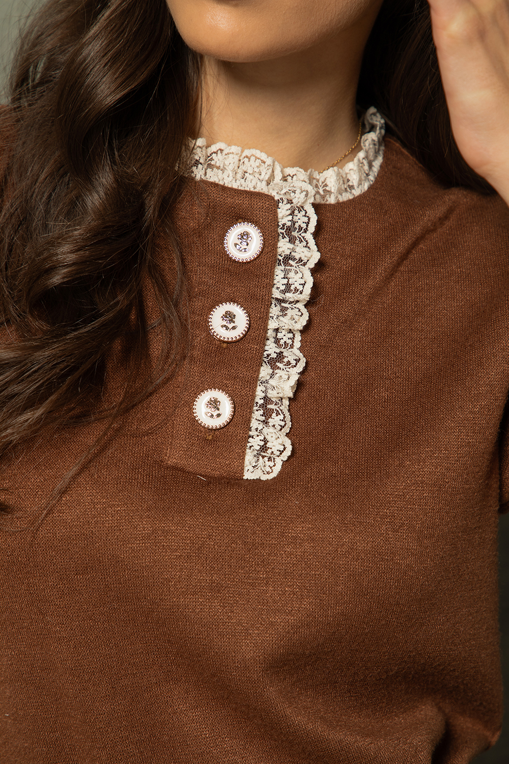 Елегантна блуза тип бомбър от мека и приятна еластична материя в шоколадово кафяво. Леко свободен силует с обло деколте и пластрон обточени с бяла дантелка и копчета. Дълъг ръкав завършен с маншет и бяла дантела.