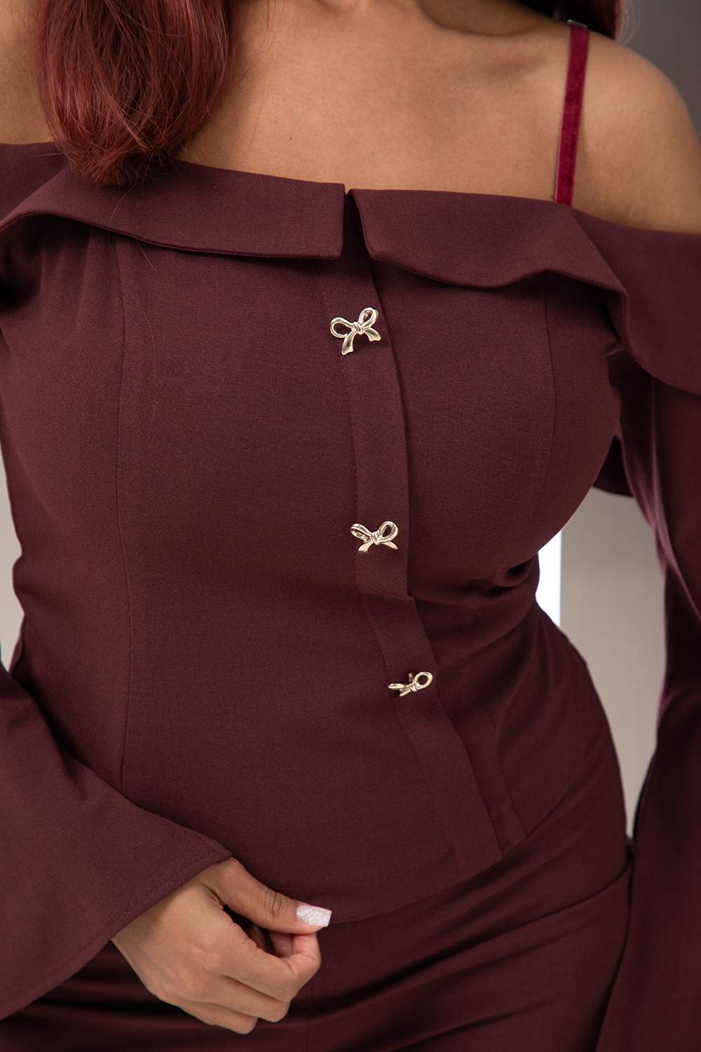 Елегнатна блуза в бордо от приятна еластична материя. Втален силует и интересна кройка с отворени рамене, презрамки и яка. Декоративни златисти панделки на предницата, дълъг клош ръкав с цепка. Задно закопчаване посредством скрит цип.