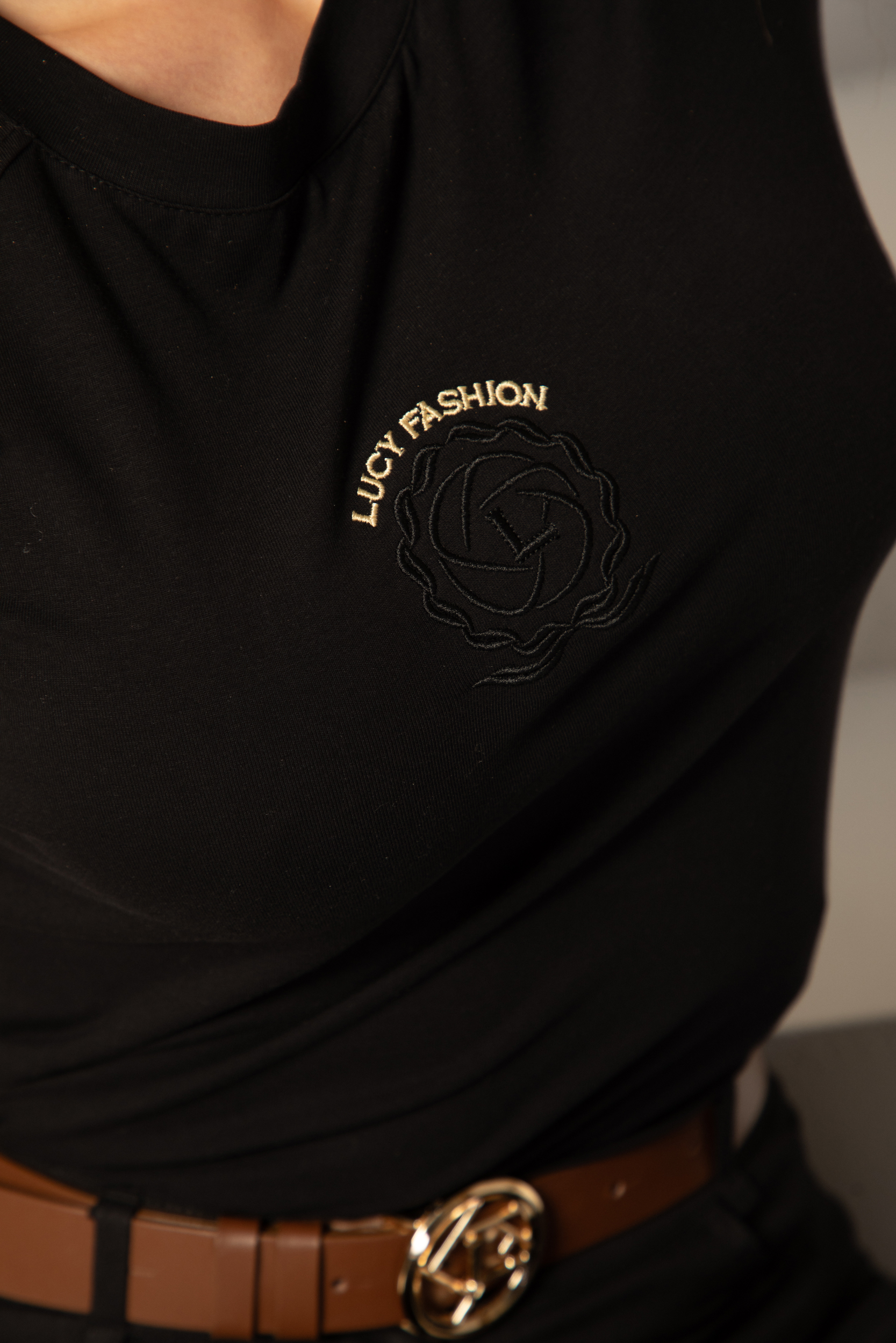 Спортно-елегантна блуза от приятно еластично памучно трико в черно. Втален силует с бродирано лого на марката. Обло деколте и 3/4 ръкав.