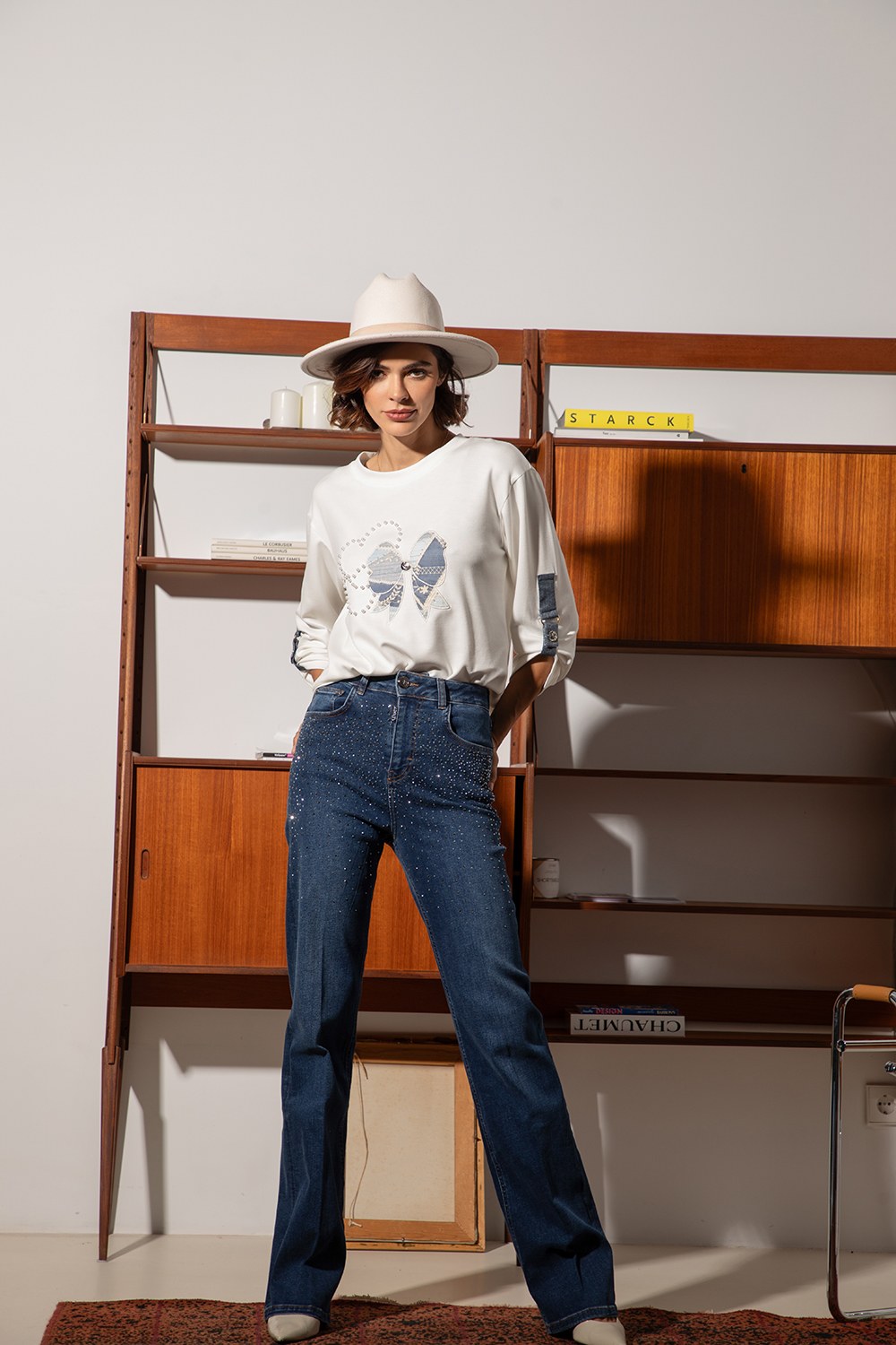 Спортно-елегантна блуза от приятно еластично трико в бяло. Свободен силует и ефектна апликация на предницата. Обло деколте и 7/8 ръкав с щрифелка.