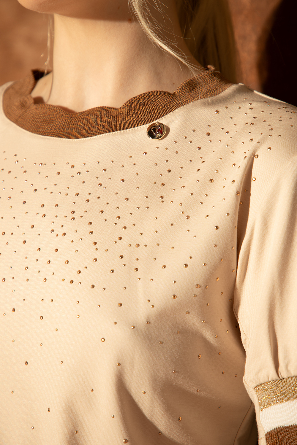 Спортно-елегантна блуза от приятно еластично трико с високо съдържание на вискоза в нежно екрю. Леко свободен силует с обло деколте от цветен щрик и къс ръкав, декориран с щрик. Предната част е обсипана с блестящи частици.