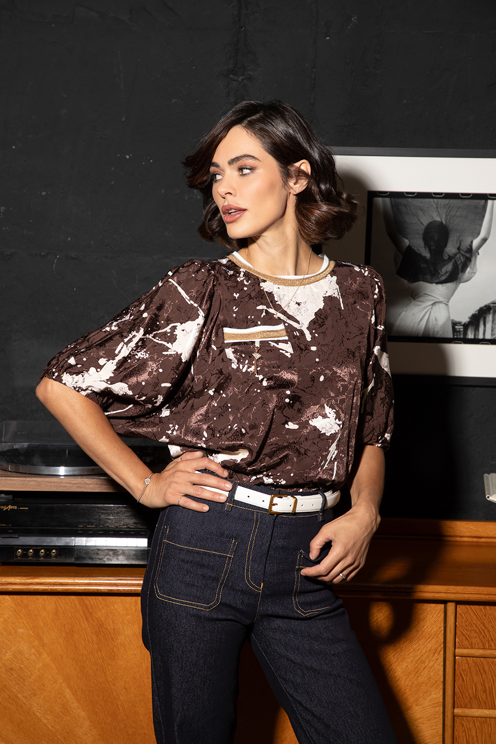 Спортно-елегантна блуза от лека вискоза с ефектен принт в кафяво. Свободен силует с 3/4 прилеп ръкав завършен с ластик. Обло деколте и джобче на предницата обточени със златисто.
