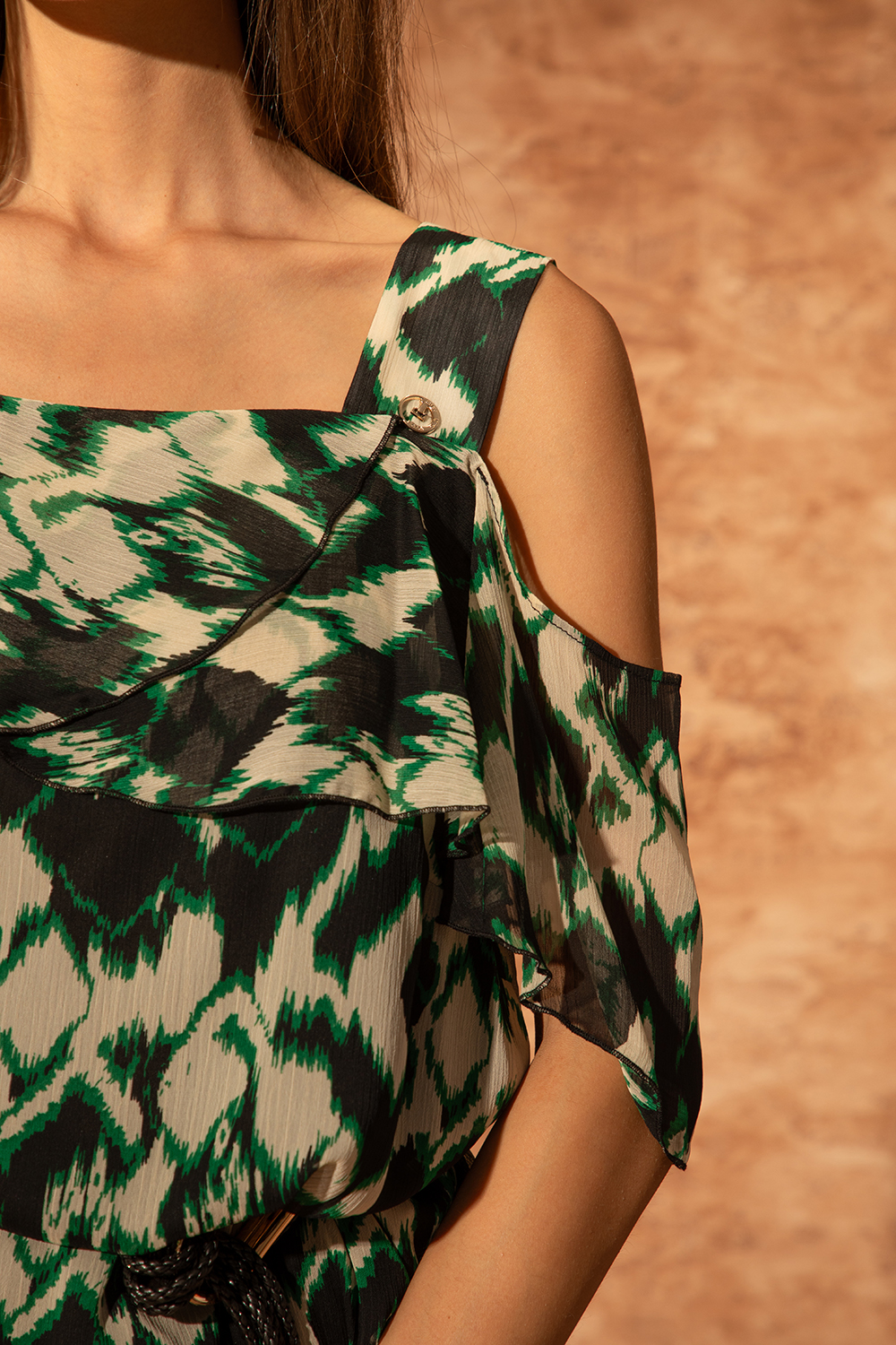 Елегантна ефирна блуза от лек шифон с ефектен принт. Свободна линия и разкошна къдра в горната част и около раменете, широки презрамки. Моделът е изработен с нежна еластична подплата в черно.