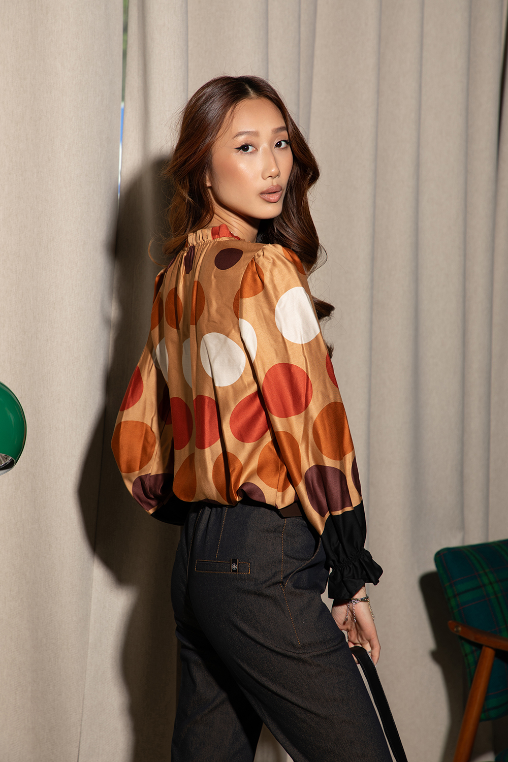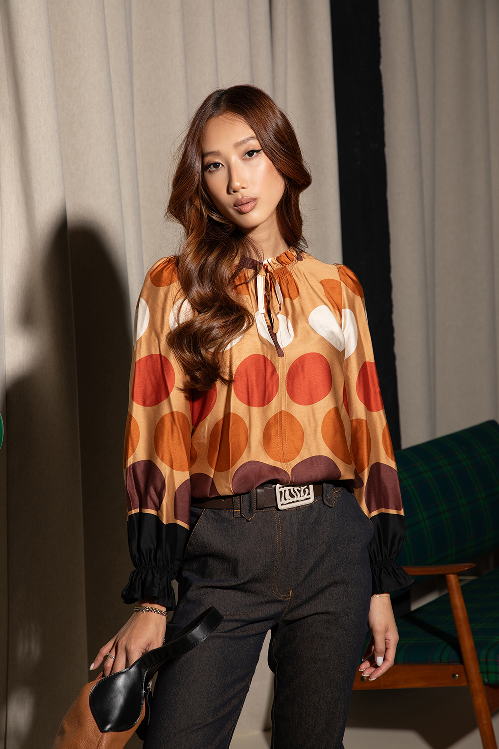 Елегантна блуза от лека вискоза с ефектен принт в топли цветове. Леко свободен силует с обло деколте с връзка и къдричка. Дълъг ръкав с ластик и къдра.