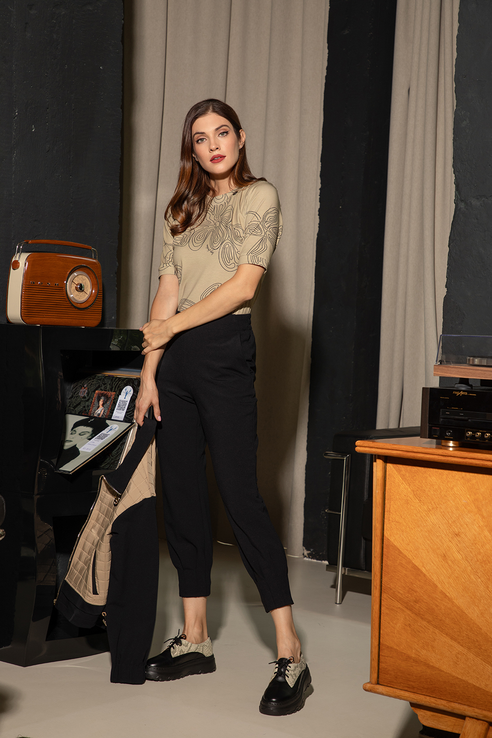 Спортно-елегантна блуза от приятно елатично трико с високо съдържание на памук в цвят капучино с флорален мотив. Втален силует с обло деколте и 3/4 ръкав.
