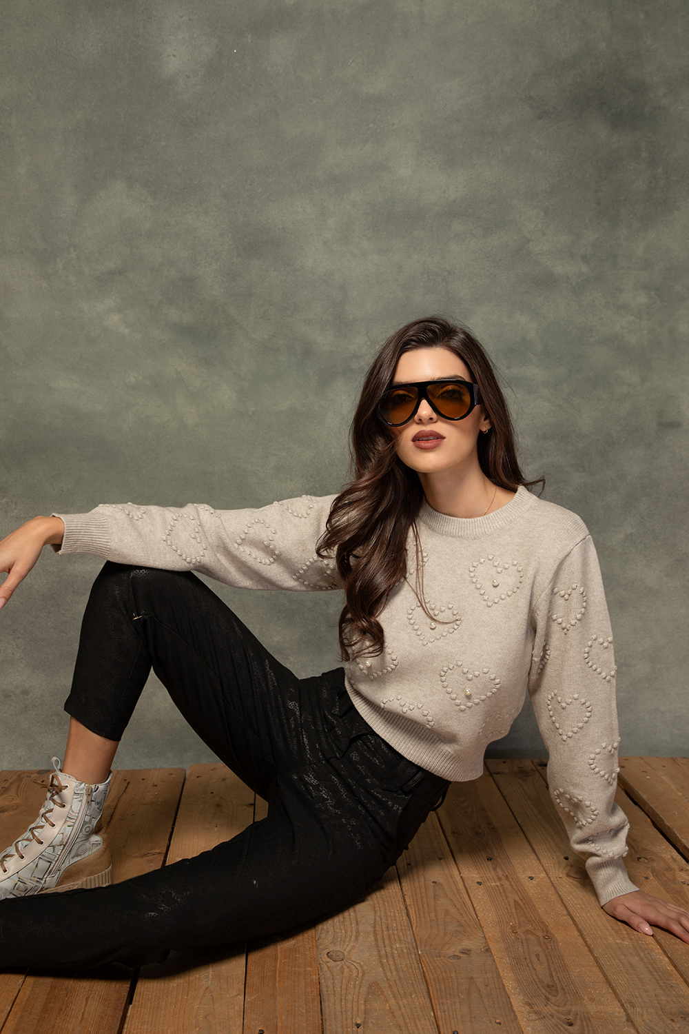 Нежна блуза в светло екрю от меко машинно плетиво. Скъсен силует с обло деколте и дълъг ръкав. Декоративни перли и релефни акценти на предницата.