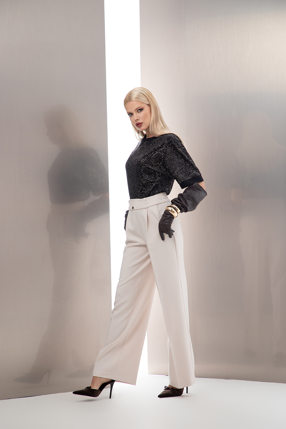 Елегантна блуза в черно от кадифе със златисти частици. Леко свободен силует с 3/4 прилеп ръкав. Обло деколте и отвор капка на гърба.