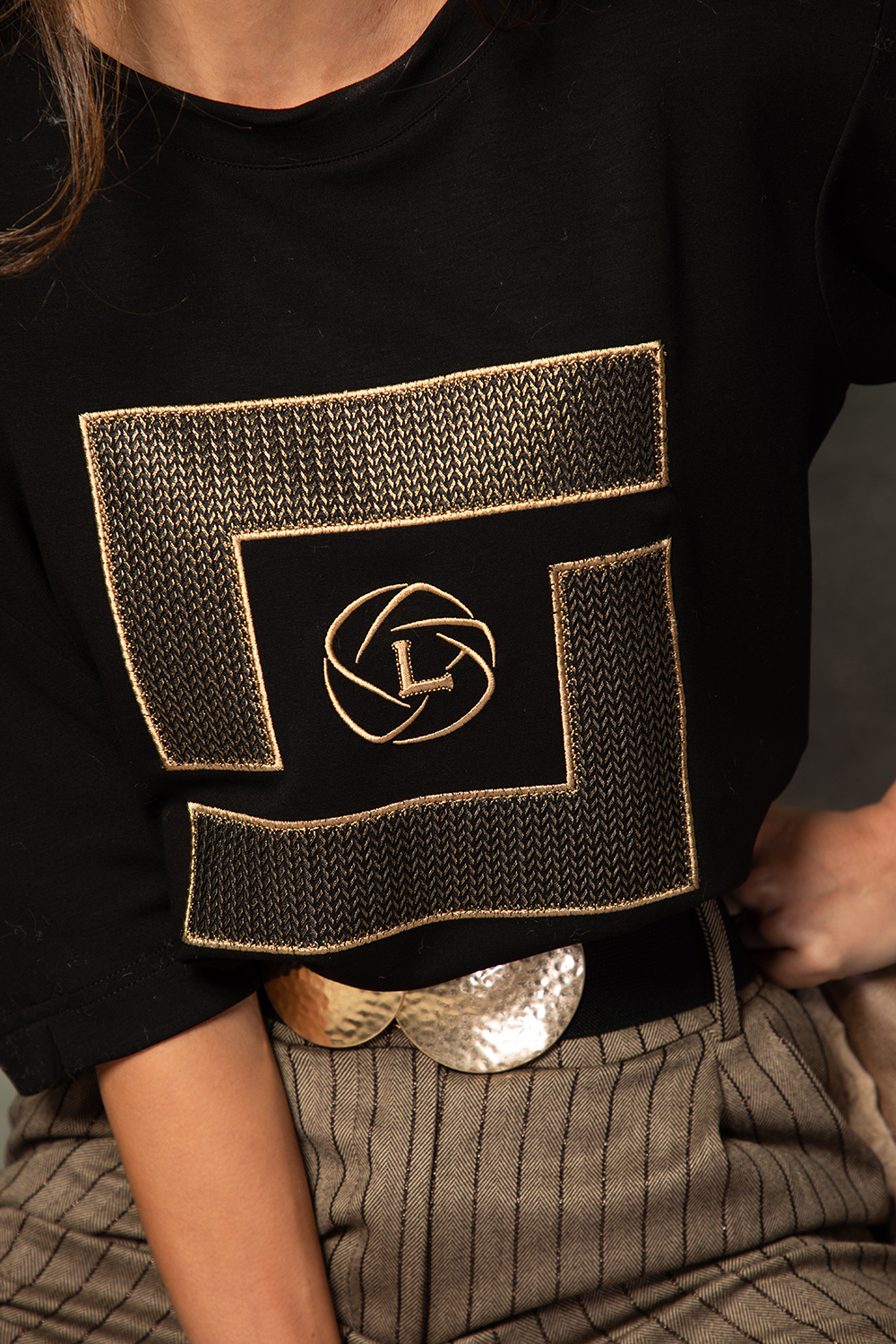 Спортно-елегантна блуза от приятна еластична материя в черно. Свободен силует с обло деколте и 7/8 ръкав с малки цепки. Ефектна апликация лого на марката в златисто и малки цепки встрани.