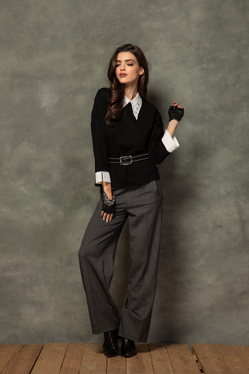 Елегантна блуза в черно от приятно еластично трико. Леко свободен силует с ефектна бяла яка декорирана с кристали и 7/8 ръкав с бял маншет.