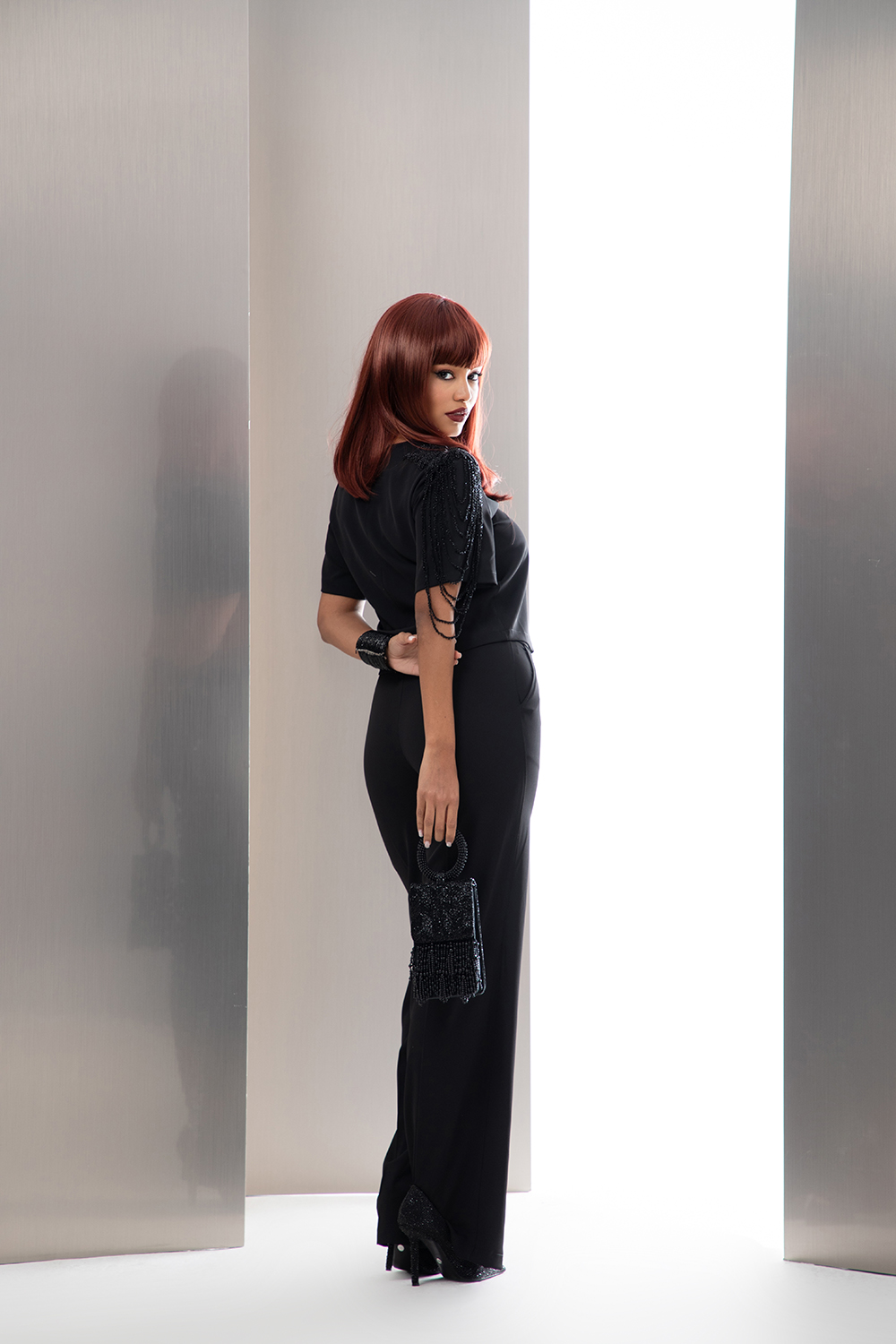 Елегантна блуза от лека еластична материя в черно. Свободен силует с обло деколте и 3/4 ръкав. Ефектно украшение от черни мъниста на едното рамо. Закопчаване посредством копче и цепка на гърба.