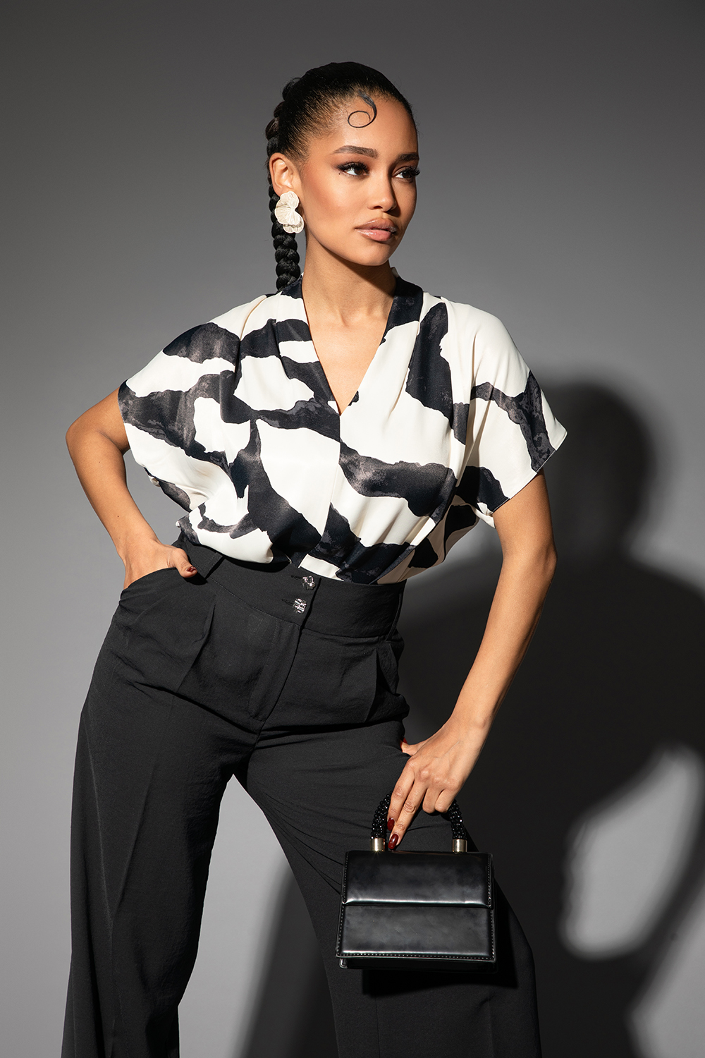 Елегантна блуза от нежна сатенирана материя в черно-бяло. Свободна кройка с V-образно деколте и къс ръкав.