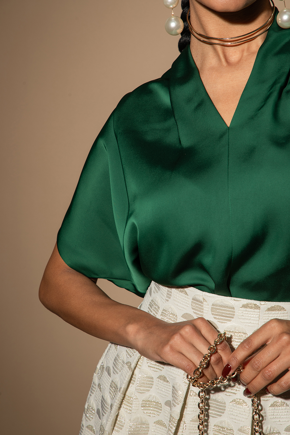 Елегантна блуза от нежна сатенирана материя в изумрудено зелено. Свободна кройка с V-образно деколте и къс ръкав.