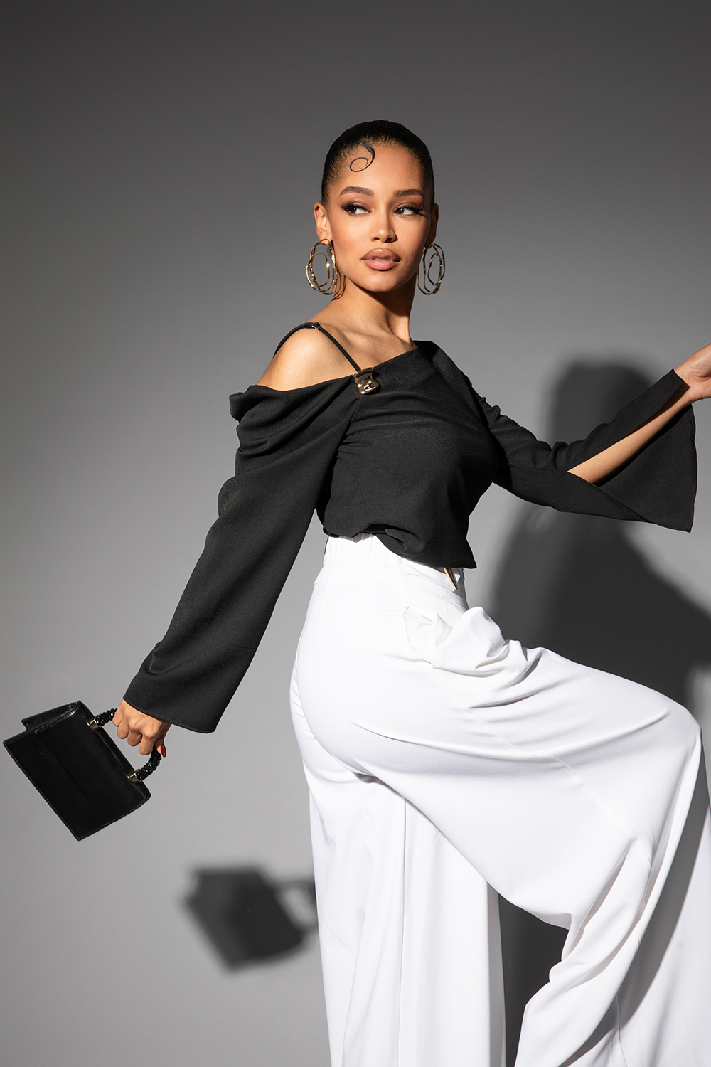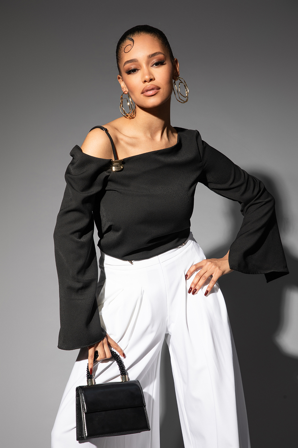 Елегантна блуза от приятна материя с високо съдържание на вискоза в черно. Леко свободен силует с изчистена линия. Овално деколте с едно отворено рамо и презрамка, декорирана с бижу. Дълъг разкроен ръкав с цепка.