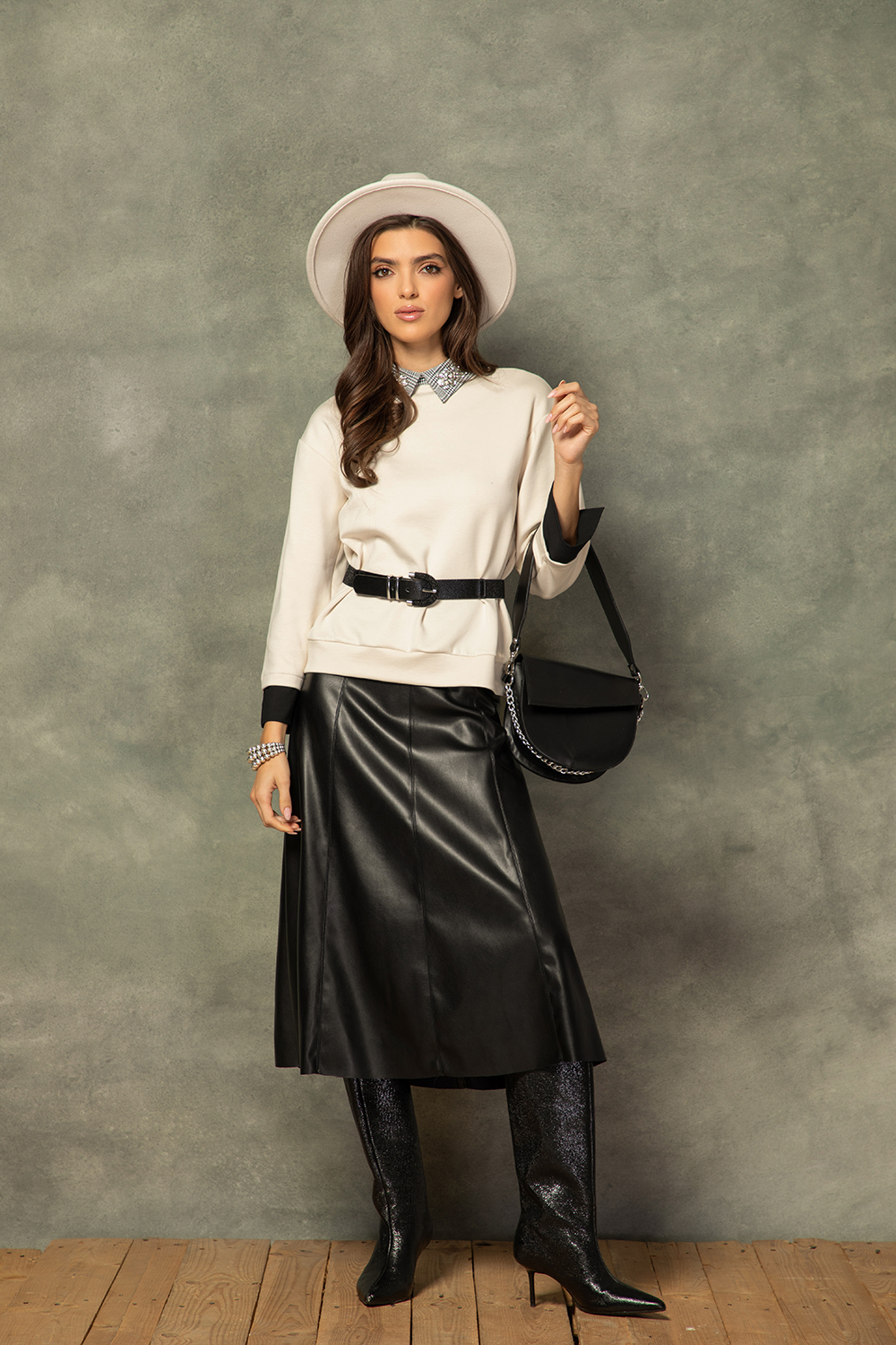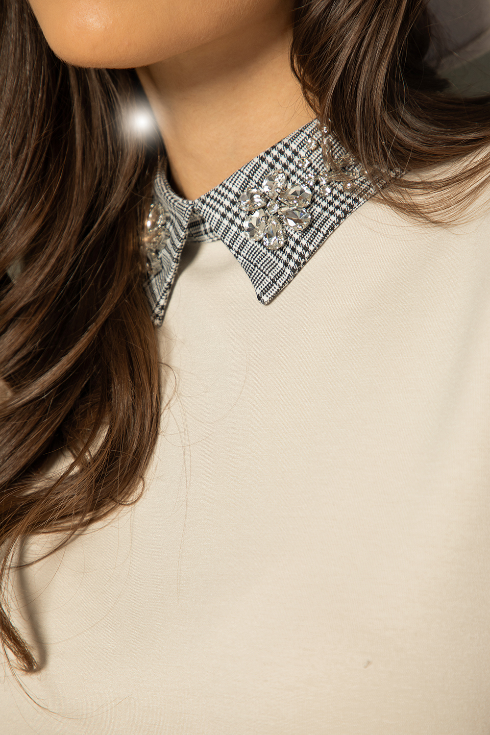 Елегантна блуза в екрю от приятно еластично трико. Леко свободен силует с яка в сиво каре декорирана с кристали и 7/8 ръкав с черен маншет.