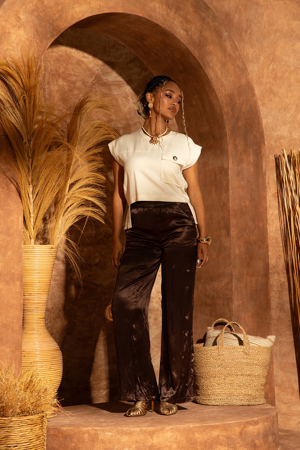Спортно-елегантна блуза от лека вискоза в натурално бяло. Скъсен свободен силует с обло деколте. Интересни детайли встрани и външен джоб с капак в предната част. Закопчаване посредством копче на гърба.
