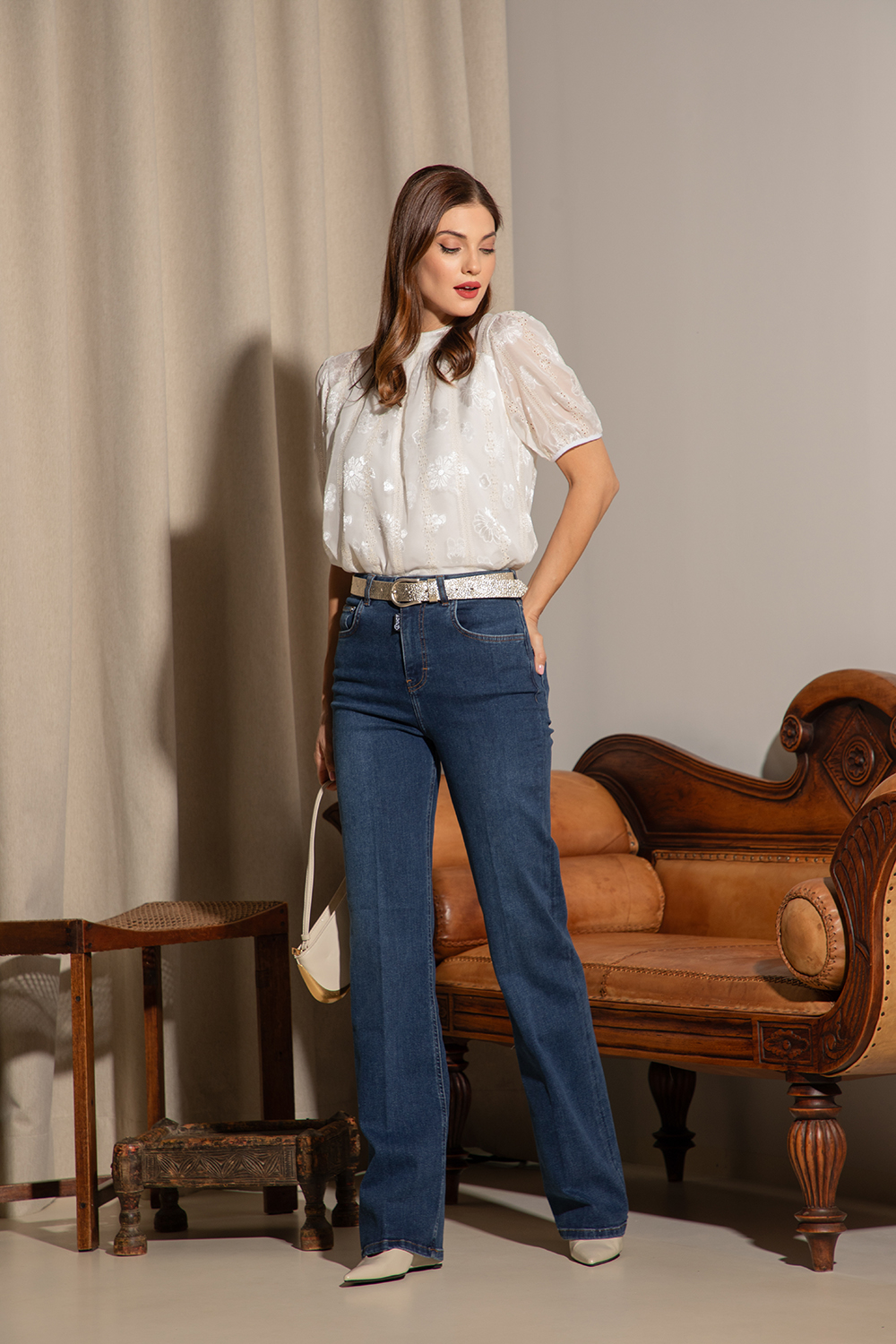 Нежна блуза в естествено бяло от лека и приятна материя с нежна рязана бродерия в екрю и флорален мотив. Леко свободен силует с обла столче яка и чупки. 3/4 ръкав и закопчаване на гърба посредством малко копче и цепка. Блузата е изработена с подплата.