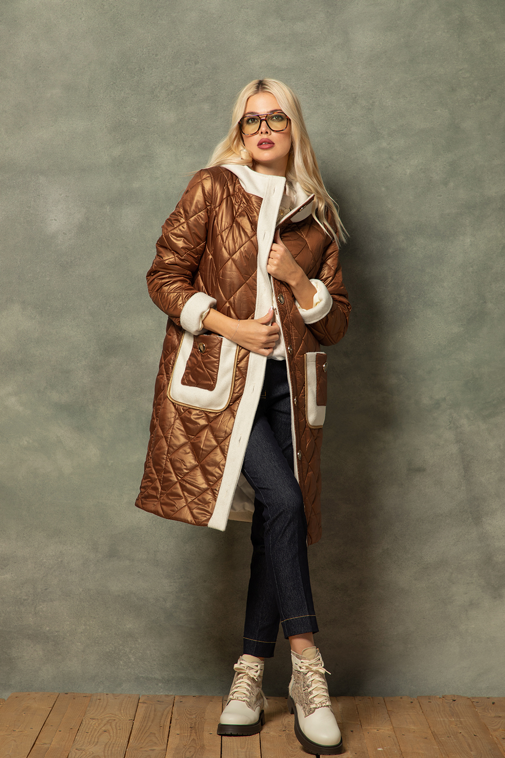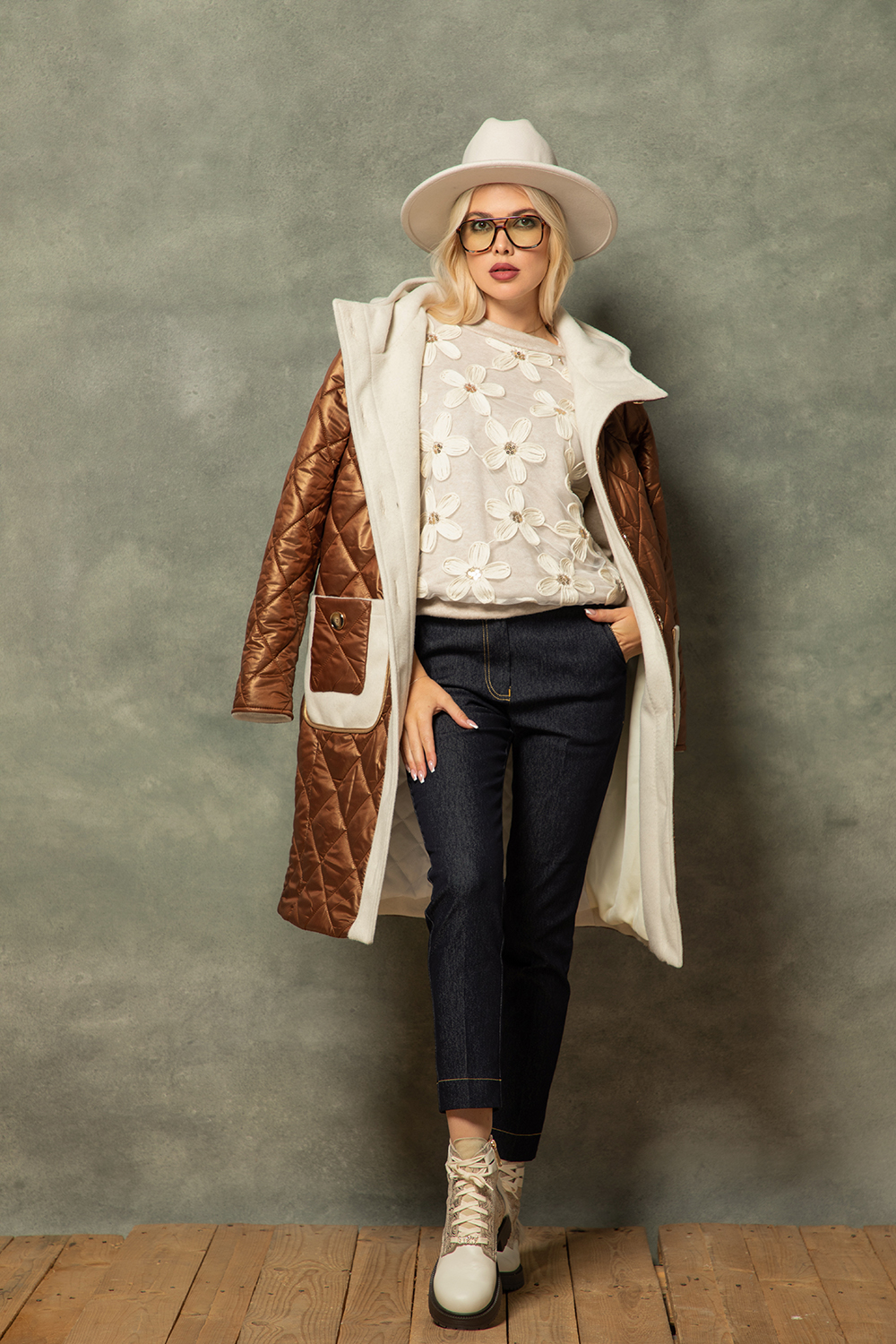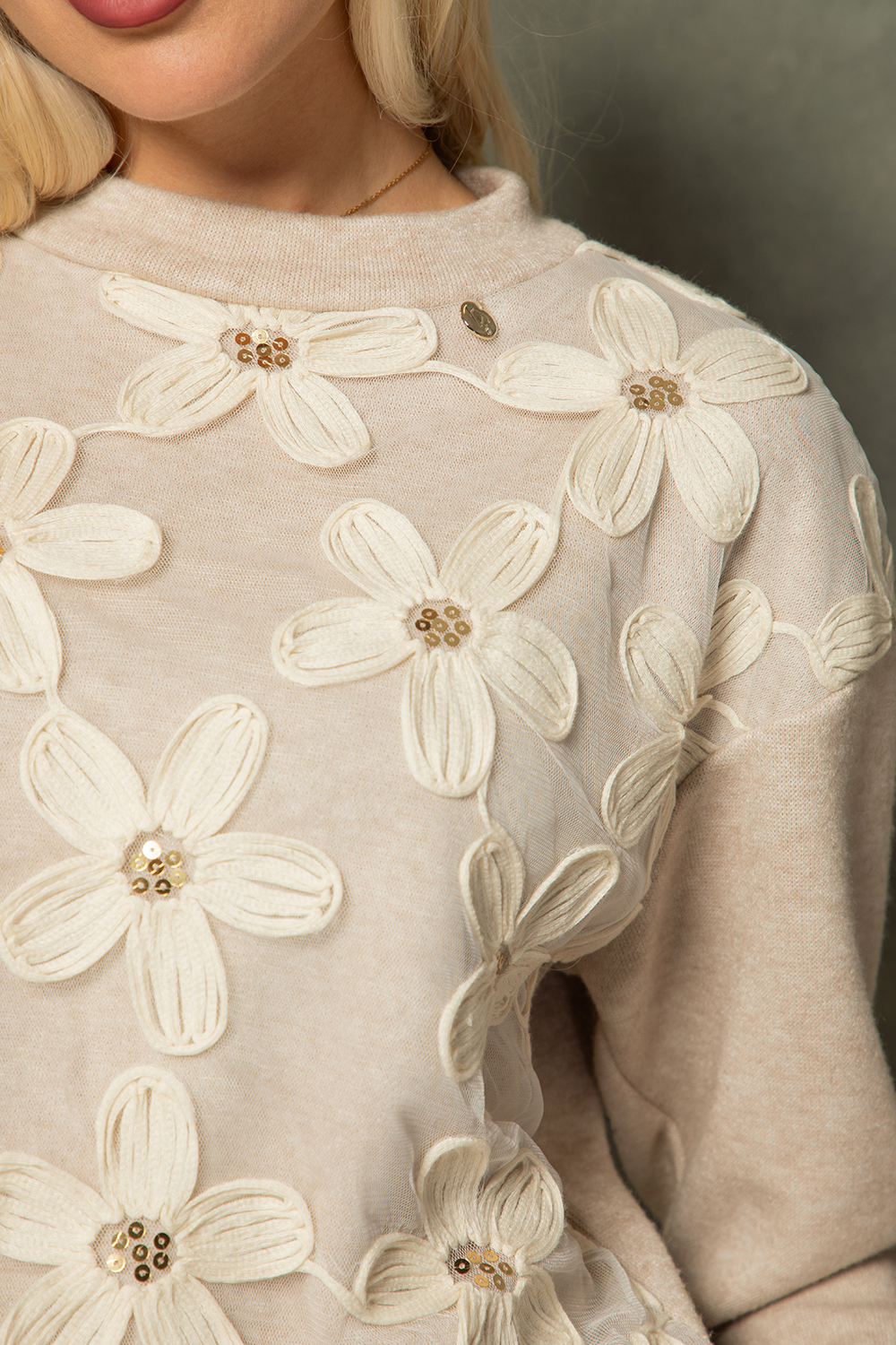 Спортно-елегантна блуза тип бомбър в светло бежово от приятна еластична материя. Свободен силует с ефектна предница с 3Д цветя. Обло деколте и 7/8 ръкав.