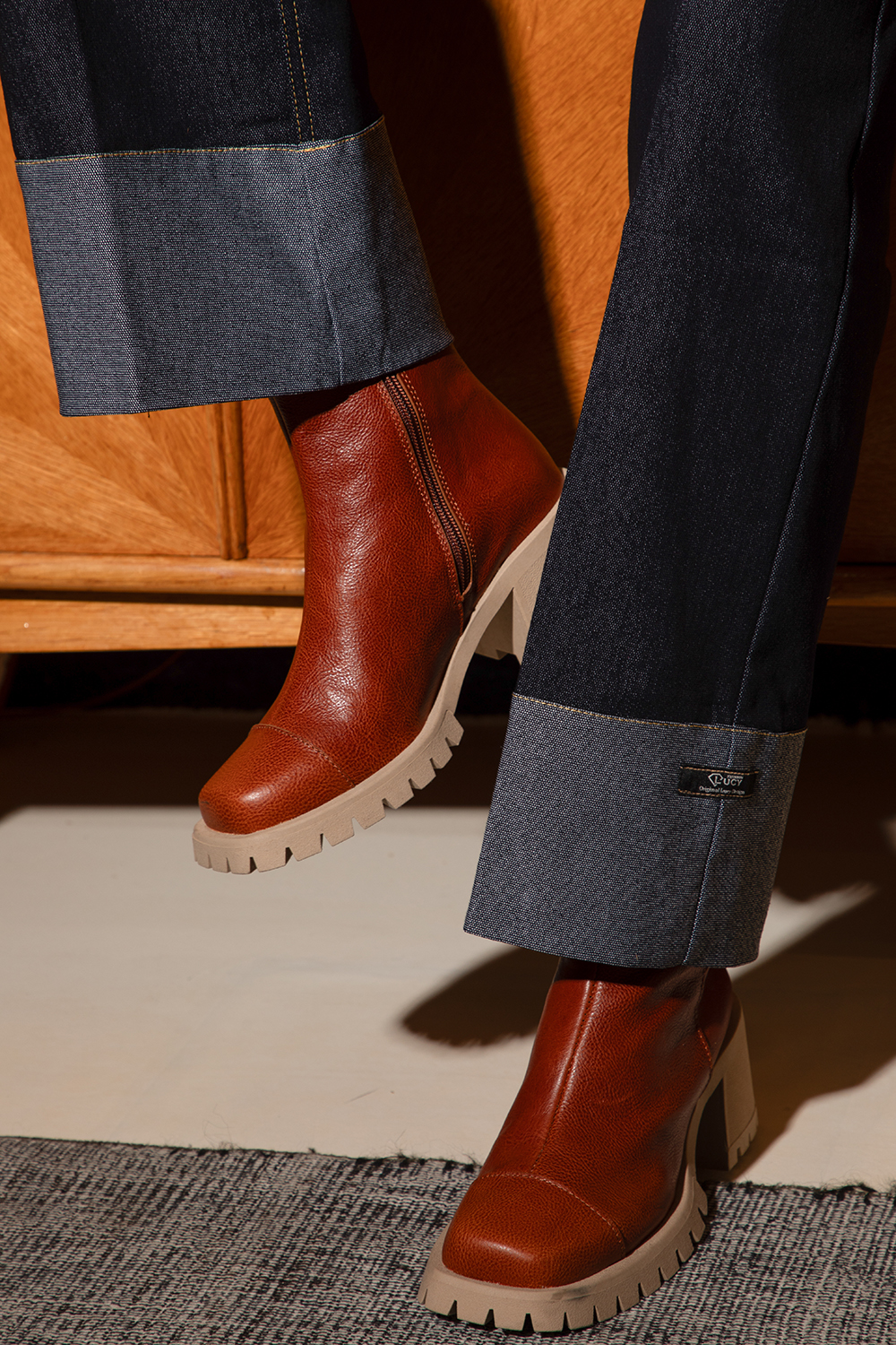 Елегантни боти от висококачествена италианска напа в цвят карамел. Средна височина и закопчаване посредством цип, ластик встрани.