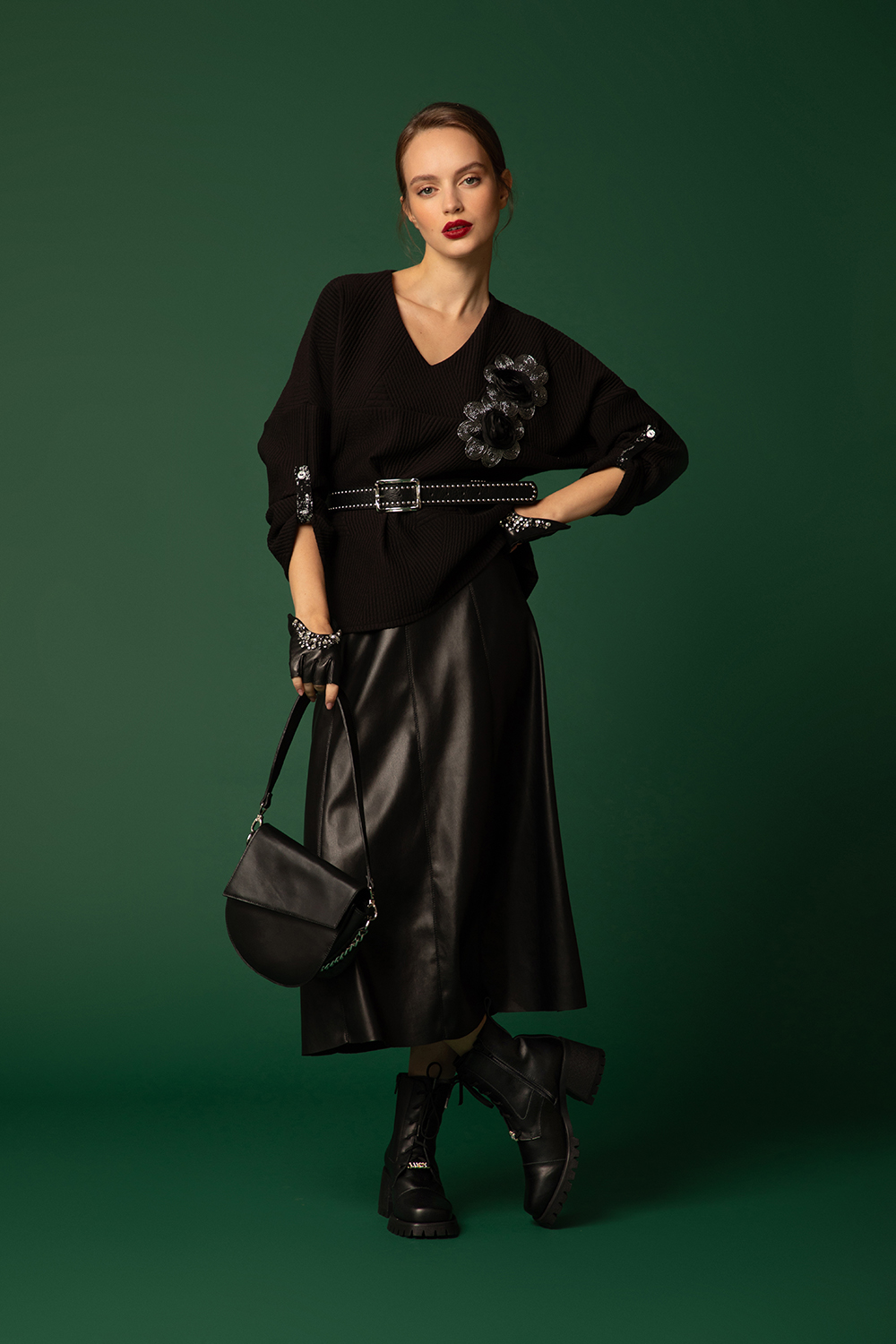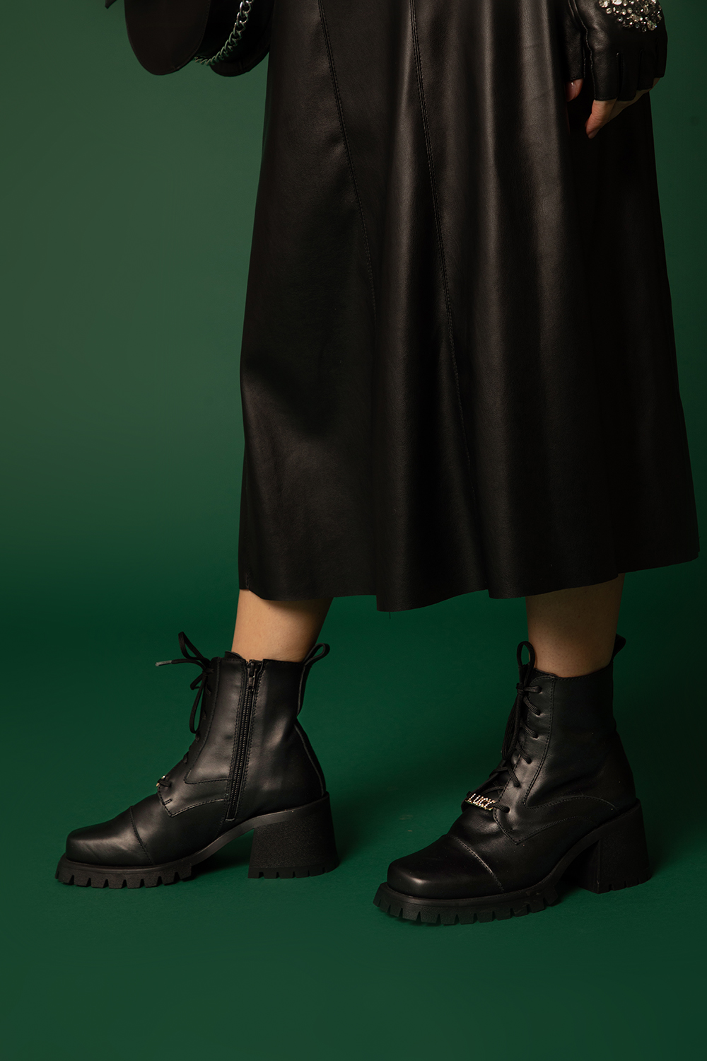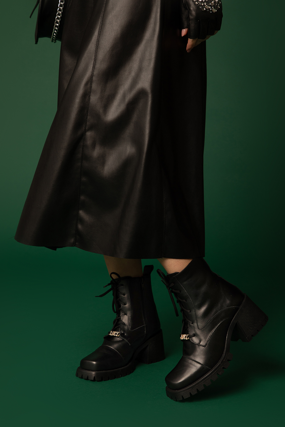 Елегантни боти от висококачествена кожа в черно и акцент златисто лого. Средна височина и закопчаване посредством цип и връзки. Комфортна подметка с ток.