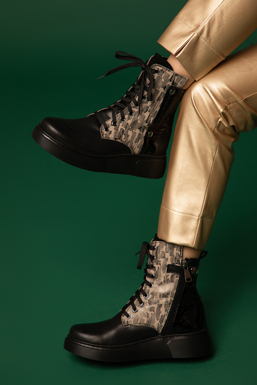 Спортно-елегантни боти от 100% естествена кожа на цяла платформа. Ефектна комбинация от цветове и материи. Средна височина с акцентни връзки и цип за по-голям комфорт.