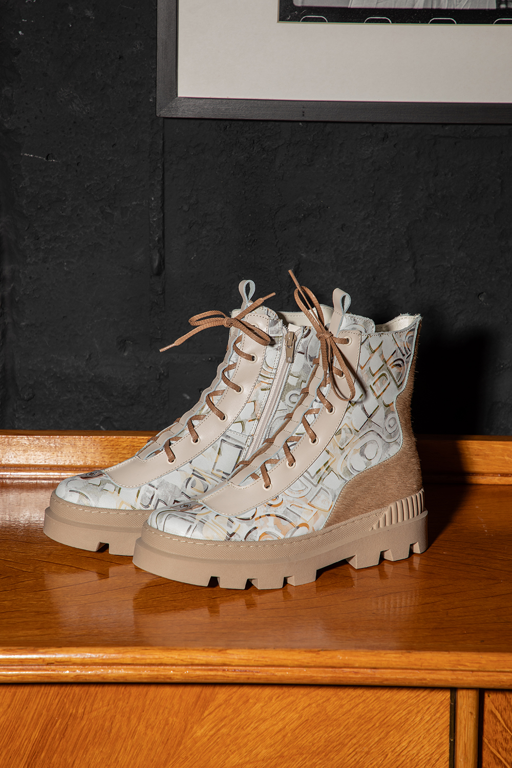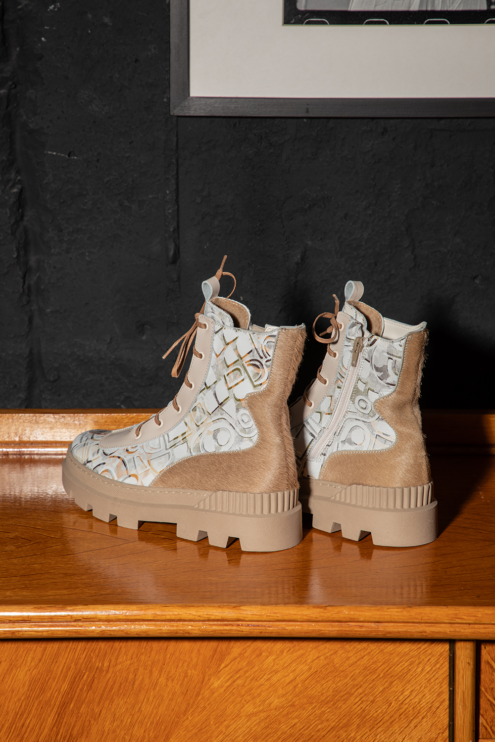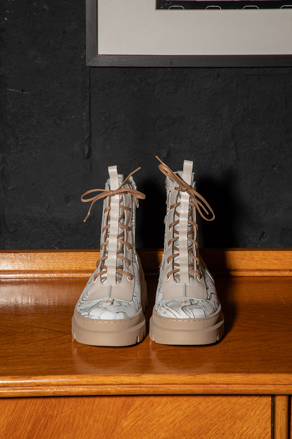 Спортно-елегантни боти от 100% естествена кожа. Ефектна комбинация от цветове и материи. Средна височина с акцентни връзки и цип за по-голям комфорт.