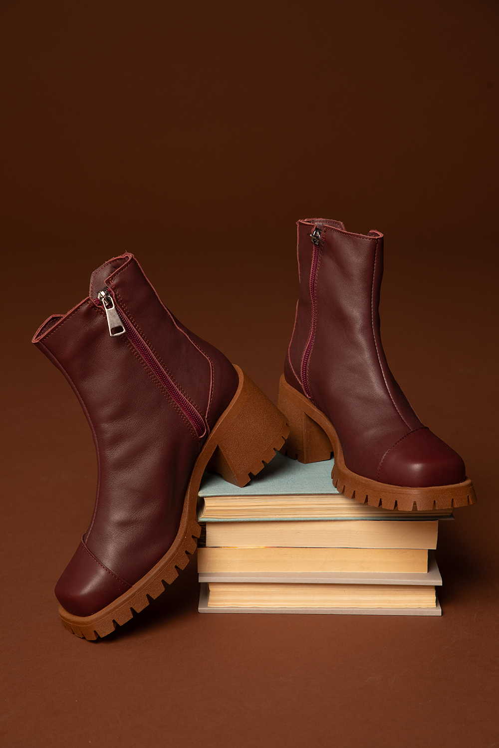 Елегантни боти от висококачествена кожа в цвят бордо и акцент релефно лого. Средна височина и закопчаване посредством цип. Комфортна подметка с ток.