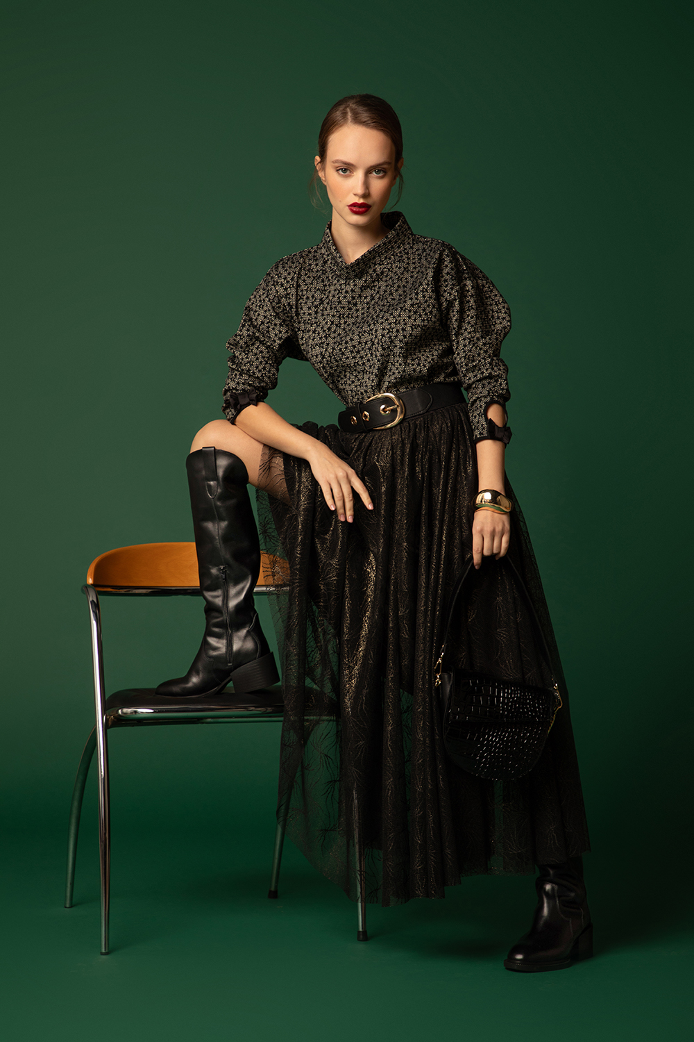 Елегантни ботуши от 100% естествена кожа в черно. Изчистен силует с висок заоблен конч. Комфортна подметка с нисък ток и частичен цип встрани.