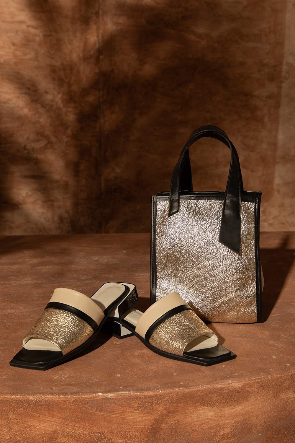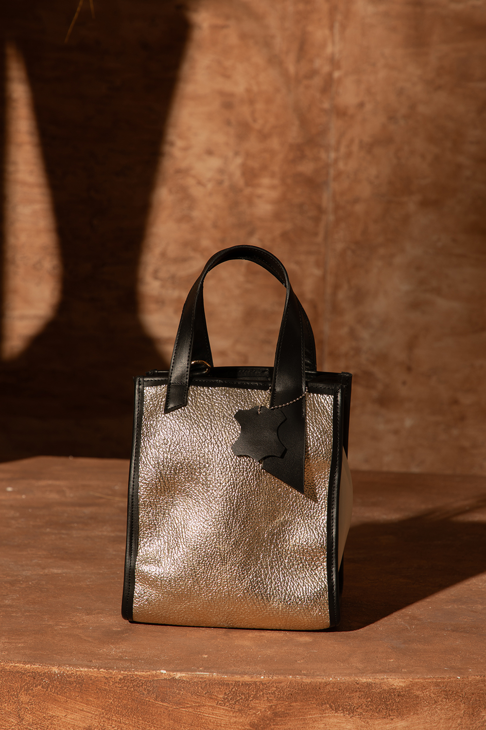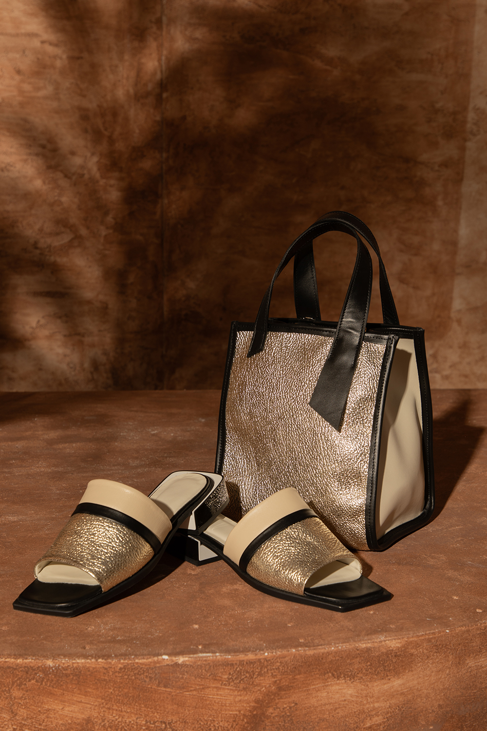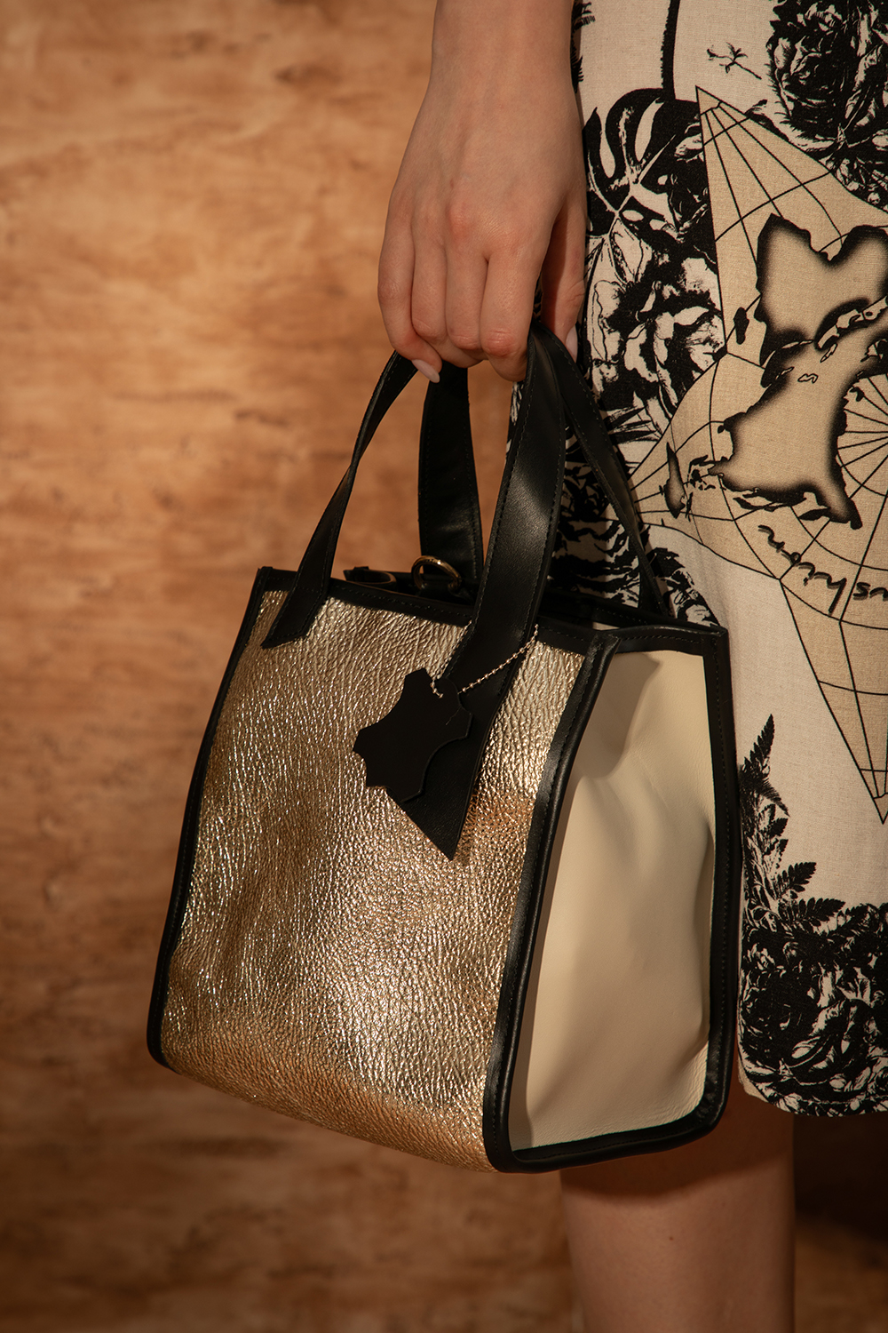 Ефектна чанта в златисто с черно окантване. Закопчаване с капса и допълнително вътрешно портмоне с цип. Подвижна дълга дръжка.