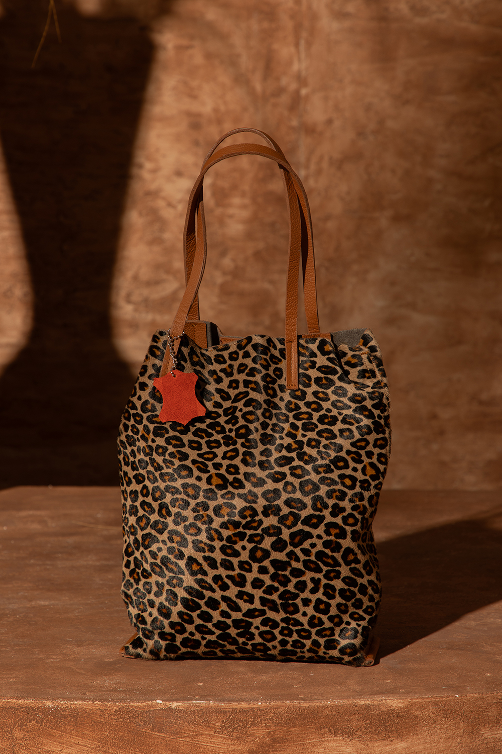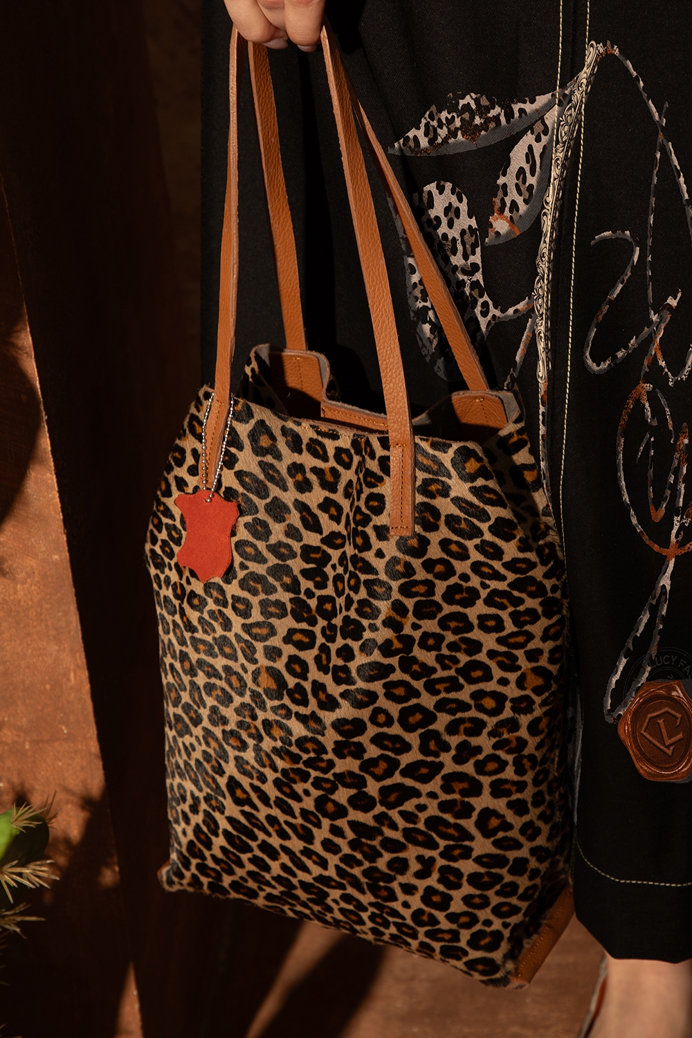 Елегантна и ефектна чанта от красива кожа с косъм в леопардов десен. Закопчаване с капса и вътрешно портмоне с цип, дълга подвижна дръжка от цветен текстил.