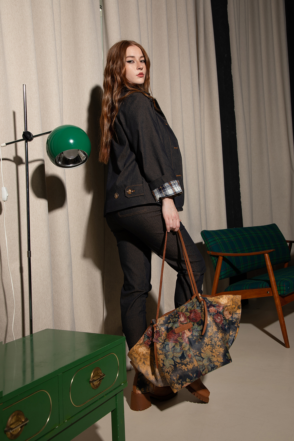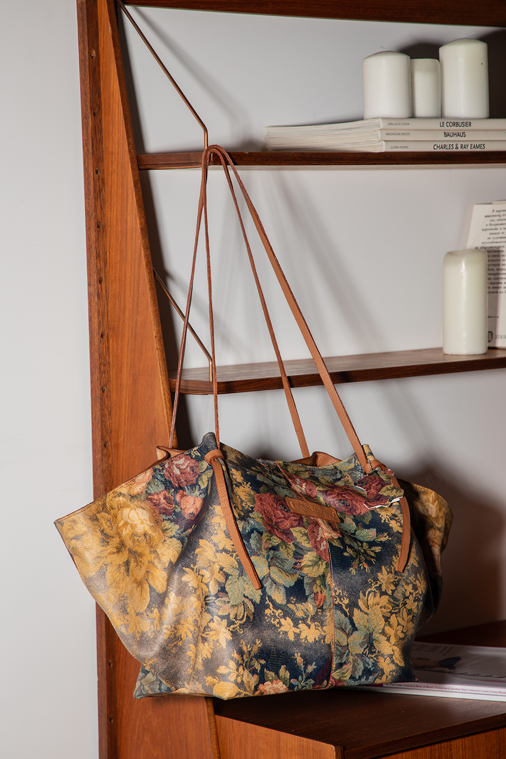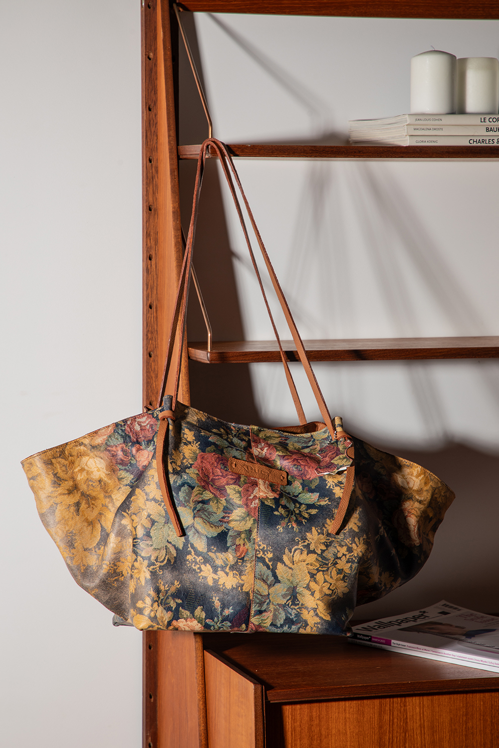Елегантна и ефектна чанта в красив флорален принт. Закопчаване с капса и вътрешно портмоне с цип. Интересна многоъгълна форма, която може да се променя посредством вътрешни капси. Дръжки от мека кафява кожа.