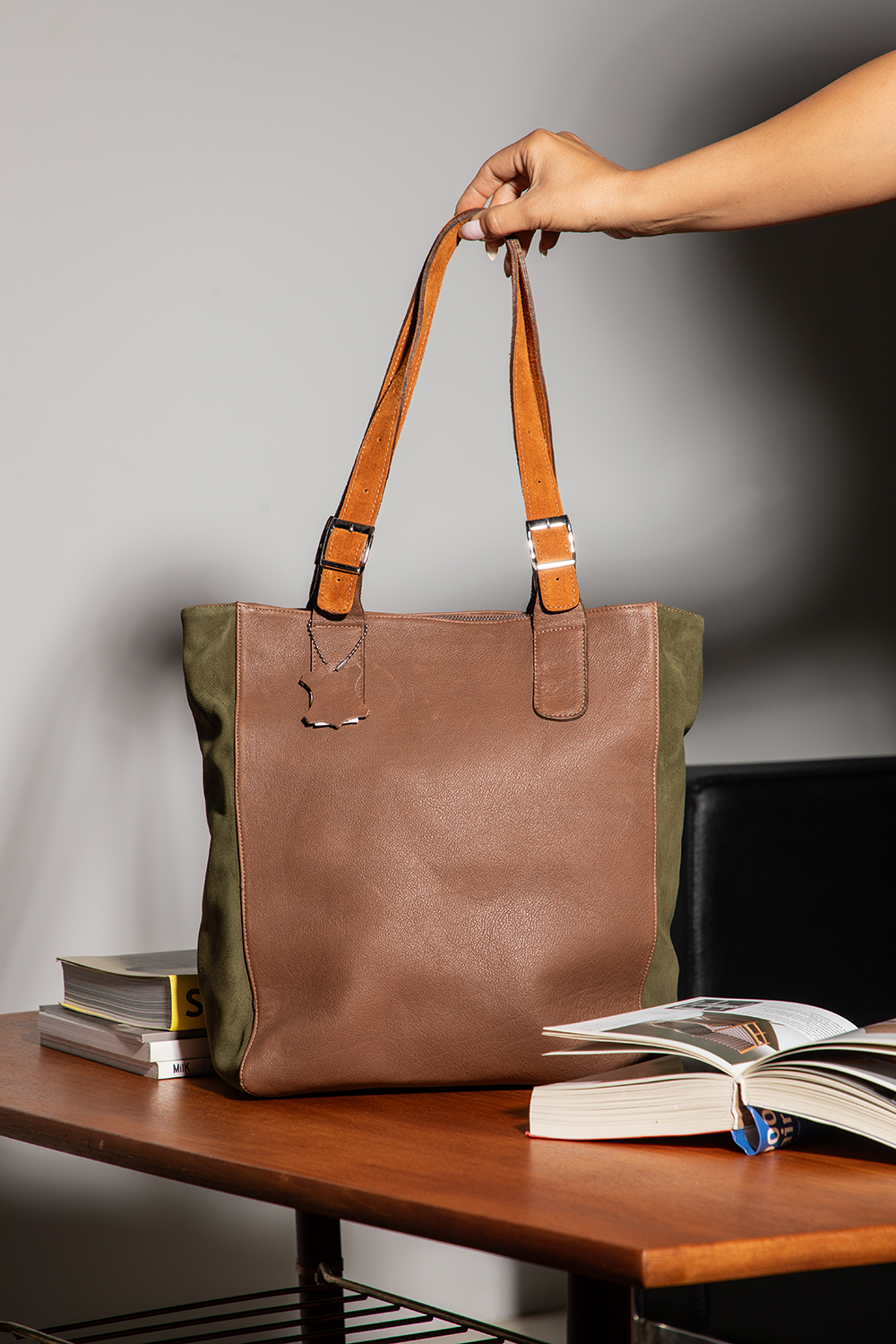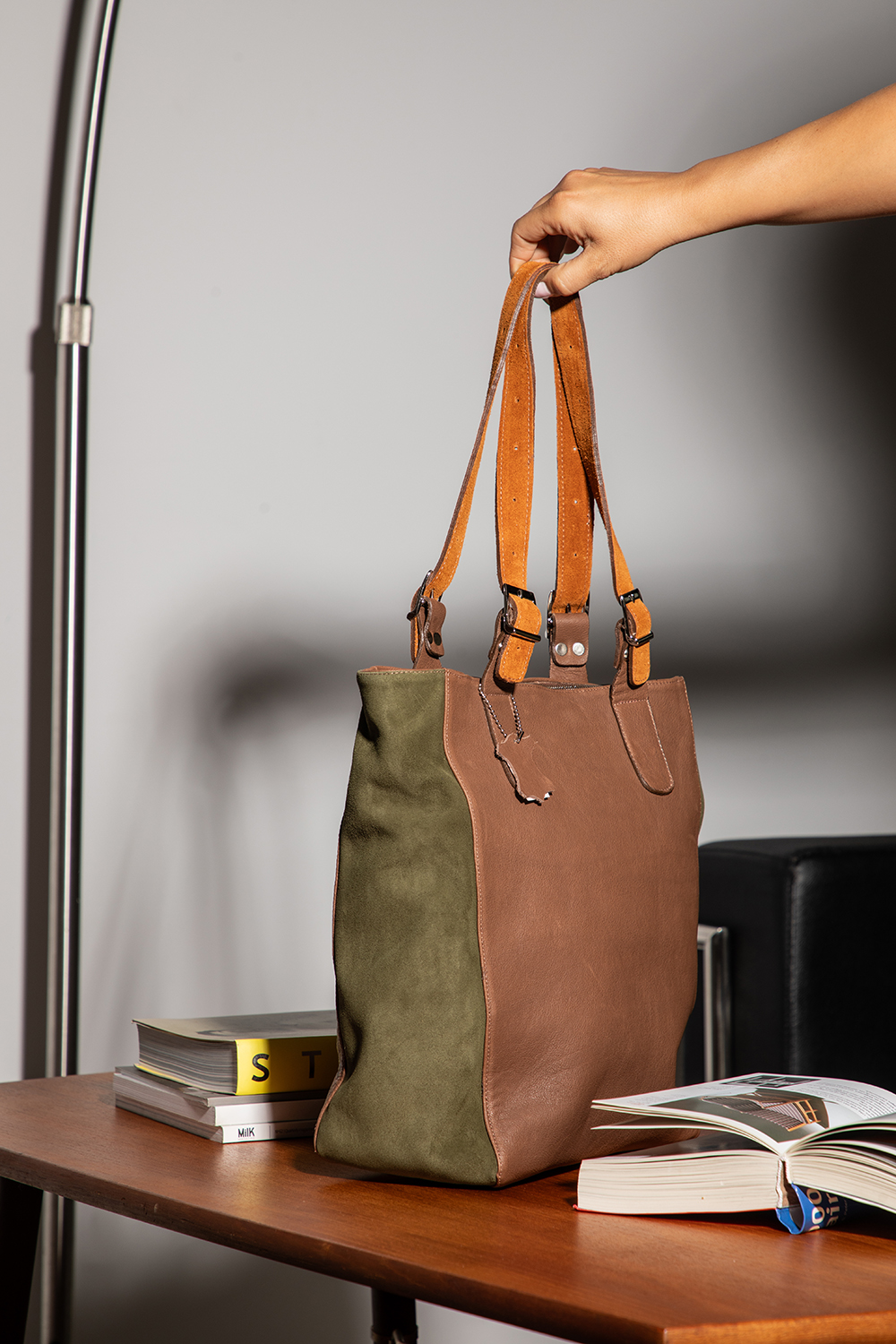 Спортно-елегантна чанта комбинация от кафяво и зелено от 100% естествена кожа. Правоъгълна форма и затваряне с цип. Две регулируеми дръжки с катарами с ефектен принт. Чантата има преграда и четири джоба без цип, както и един с цип.