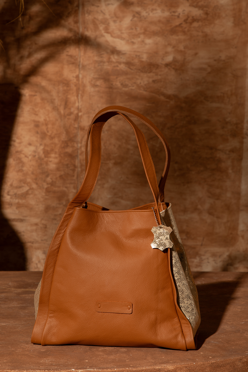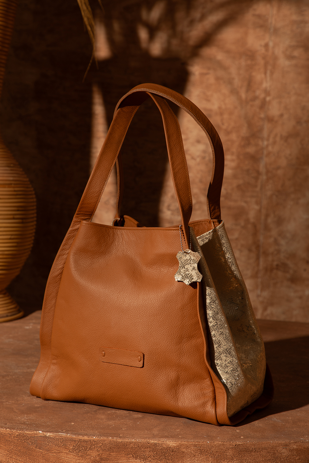 Стилна и ефектна чанта от 100% естествена кожа в цвят коняк и златисто. Един вътрешен джоб без цип, магнитно закопчаване и средно дълги дръжки.