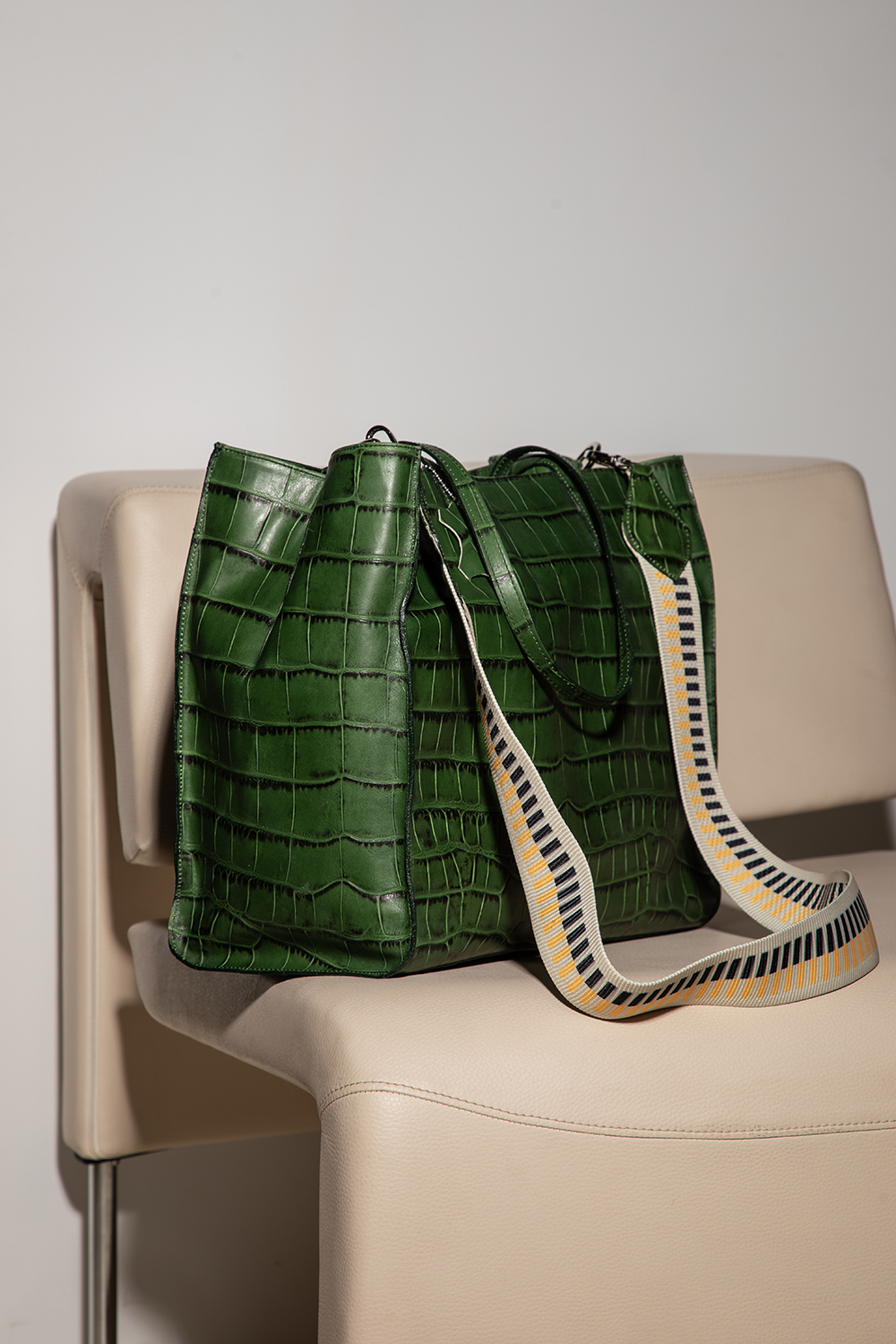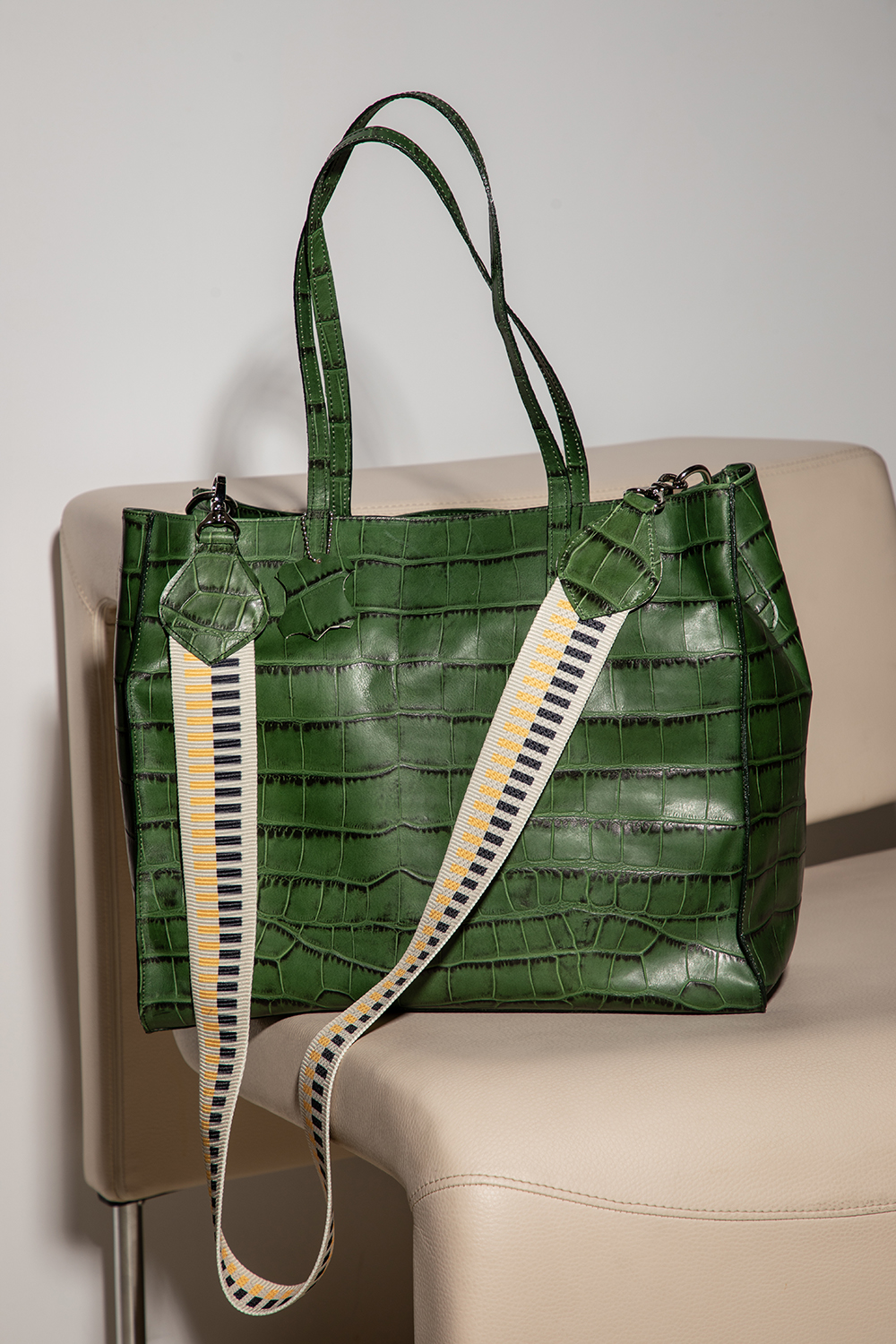 Спортно-елегантна голяма чанта в маслиново зелено от висококачествена естествена кожа с кроко ефект. Правоъгълна форма с две дръжки, допълнително дълга подвижна дръжка от текстил в контрастни цветове. Закопчаване посредством цип. Вътрешната част е подплатена с хастар и има джоб с цип.