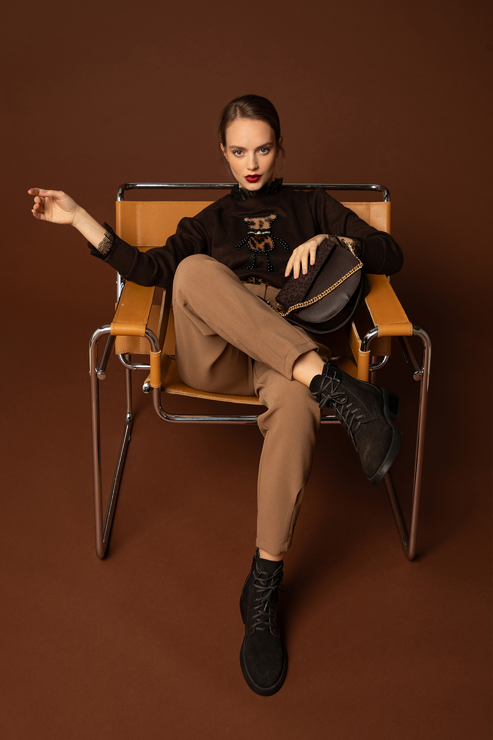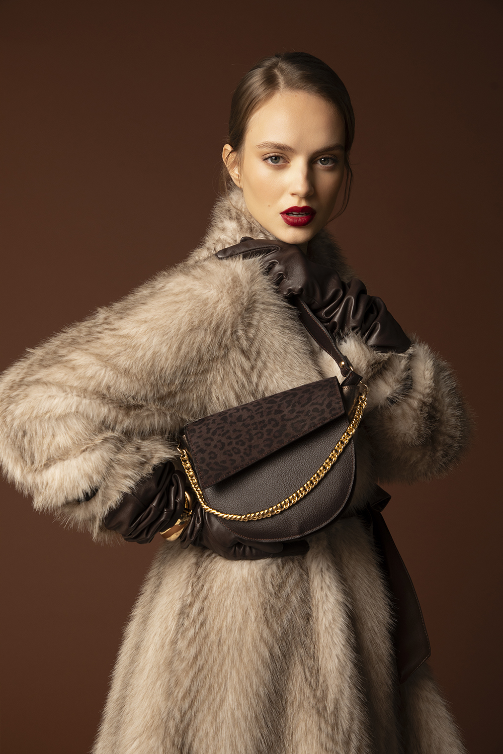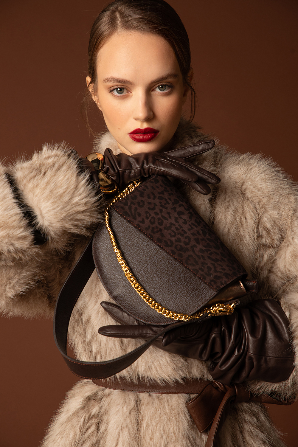 Елегантна чанта от 100% естествена кожа в комбинация от кафяво и леопардов принт. Закопчаване посредством капак с капса и цип. Две подвижни дръжки по-къса и дълга за през рамо, както и декоративна верижка. Едно отделение с малък вътрешен джоб с цип.