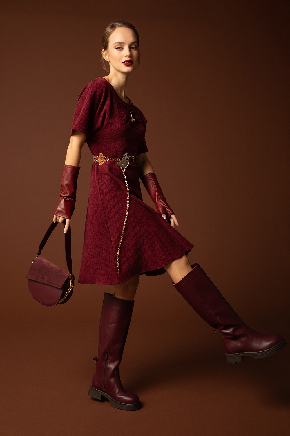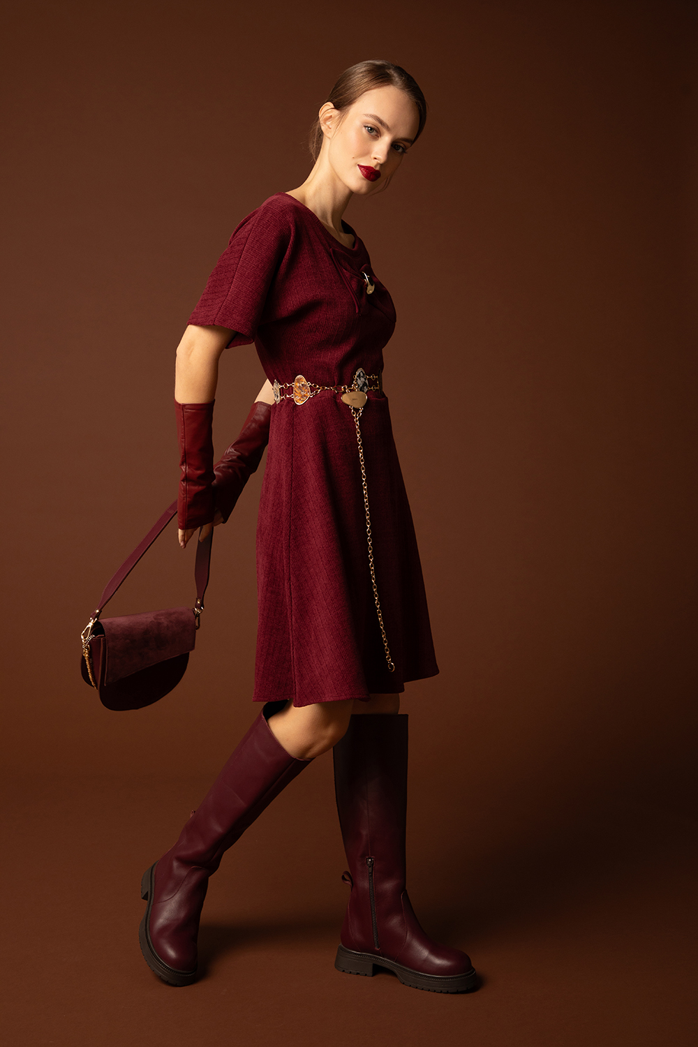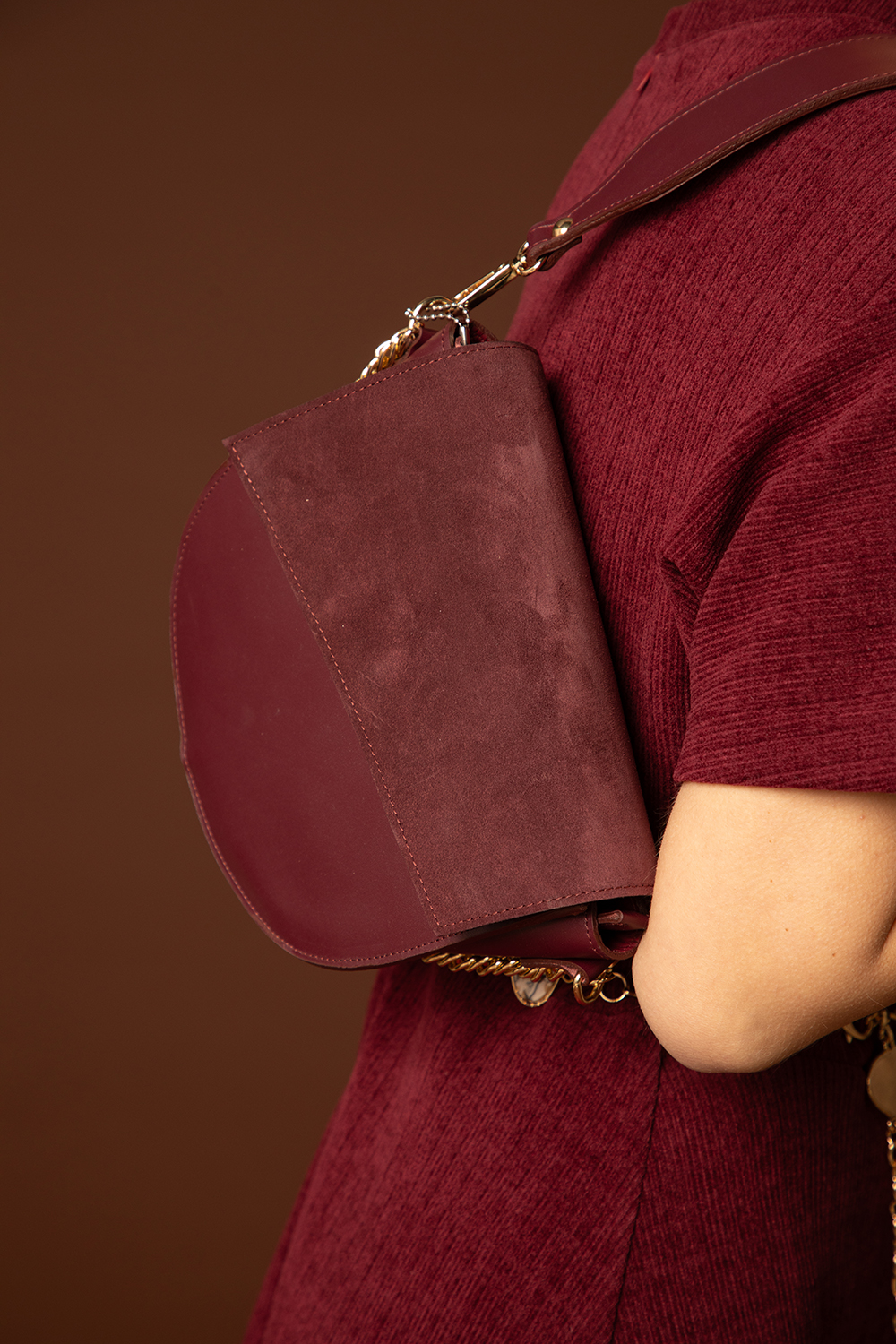 Елегантна чанта от 100% естествена кожа в цвят бордо. Закопчаване посредством капак с капса и цип. Две подвижни дръжки по-къса и дълга за през рамо, както и декоративна верижка. Едно отделение с малък вътрешен джоб с цип.