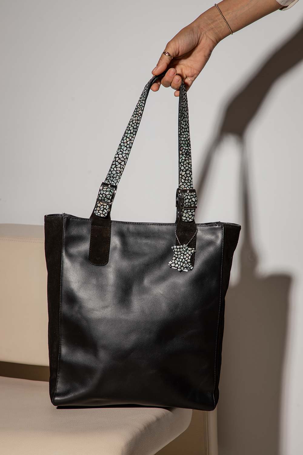 Спортно-елегантна чанта в черно от 100% естествена кожа. Правоъгълна форма и затваряне с цип. Две регулируеми дръжки с катарами с ефектен принт. Чантата има преграда и четири джоба без цип, както и един с цип.