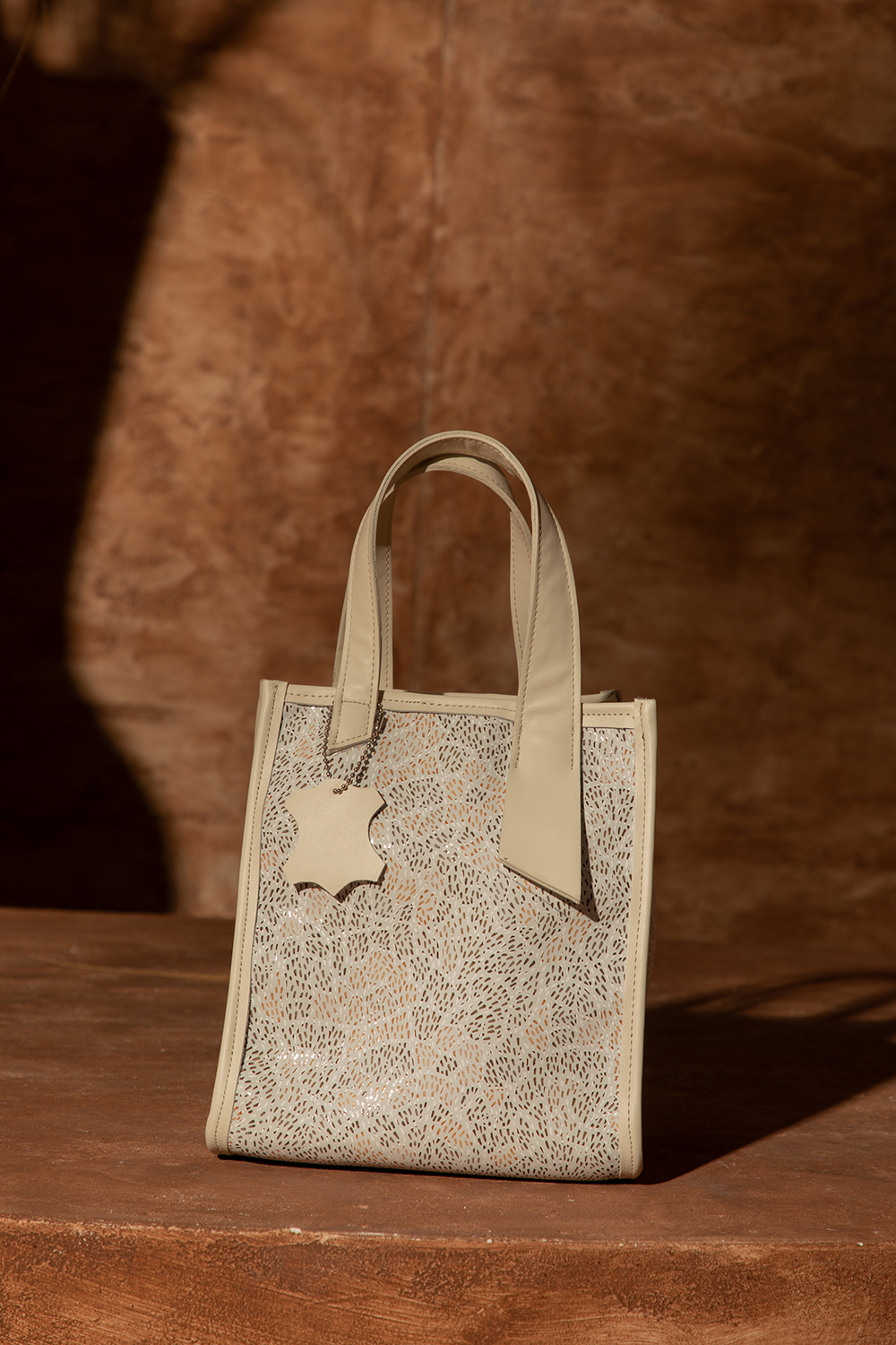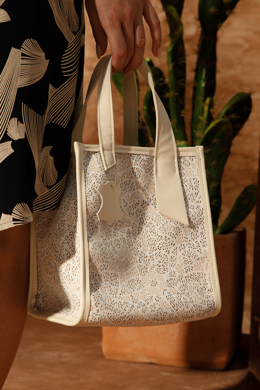 Ефектна чанта в бяло на малки черни чертички. Закопчаване с капса и допълнително вътрешно портмоне с цип. Подвижна дълга дръжка.