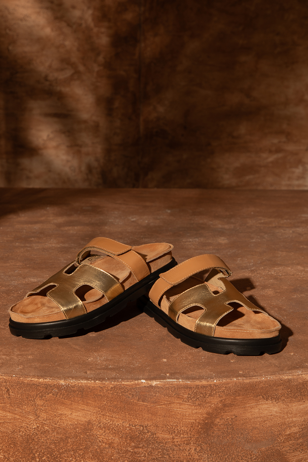Елегантни чехли от 100% ествествена кожа в цвят камел и златисто. Комфортна подметка и семпъл дизайн. Велкро за допълнително удобство.