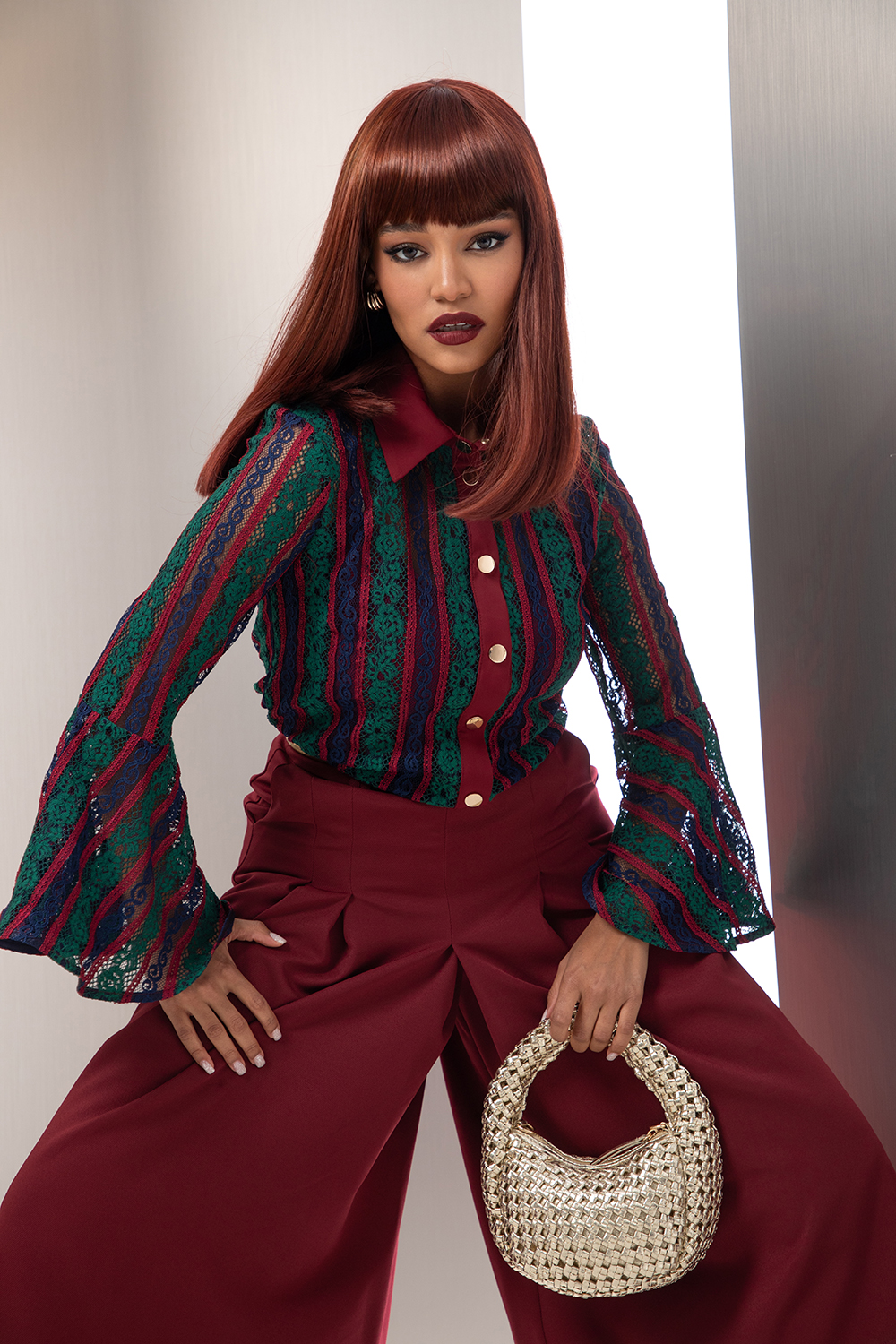 Елегантна риза от ефектна дантела в райе. Леко втален силует с предно закопчавне посредством тик так копчета и яка в бордо. Дълъг клош ръкав. Ризата е с отделна подплата от елатична материя в бордо.