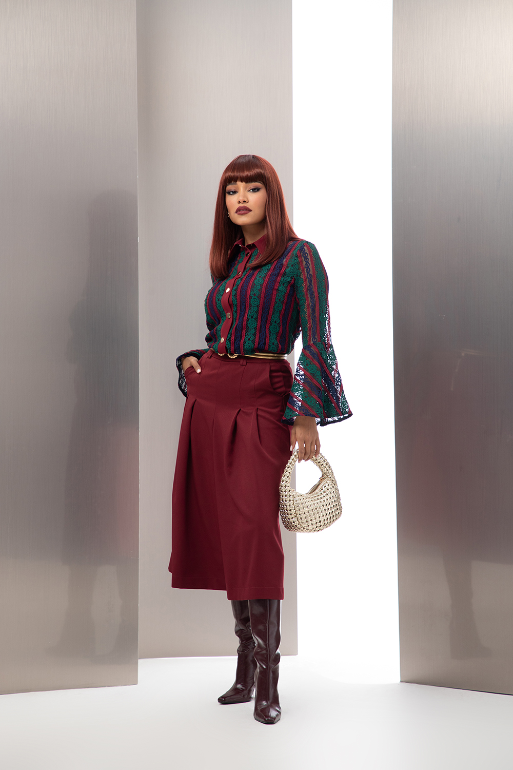 Елегантна риза от ефектна дантела в райе. Леко втален силует с предно закопчавне посредством тик так копчета и яка в бордо. Дълъг клош ръкав. Ризата е с отделна подплата от елатична материя в бордо.