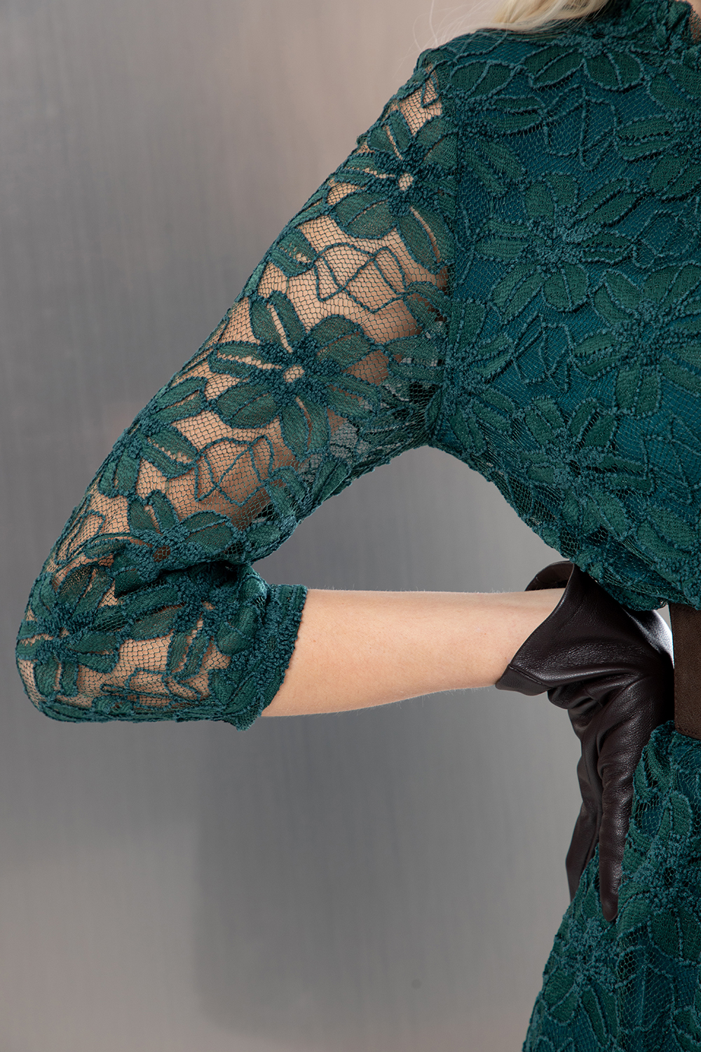 Елегантна рокля в петролено от красива дантела. Леко втален силует със 7/8 ръкав. Обло деколте с къдричка и закопчаване с копче на гърба. Моделът е изработен с еластична подплата в същия цвят.