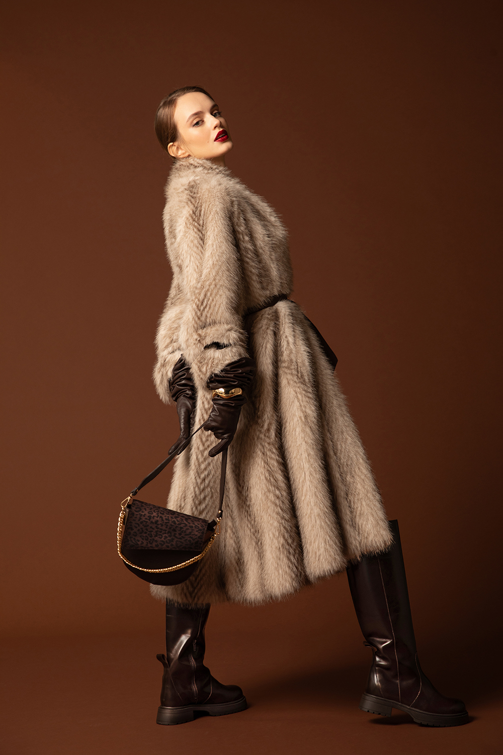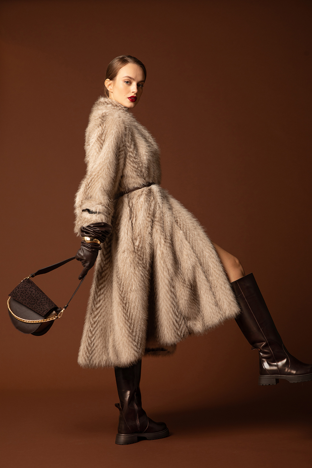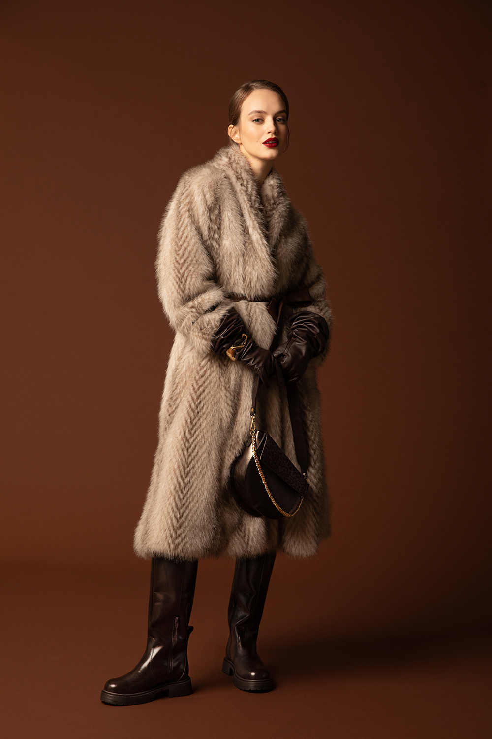 Елегантно дълго палто от еко косъм в бежово-кафята гама. Леко втален силует с разкроена долна част и шал яка. Подвижен колан и ръкав декориран с кафява еко кожа. Закопчаване посдредством едно копче отпред и два странични джоба. Палтото е изцяло подплатено с лека подплата.