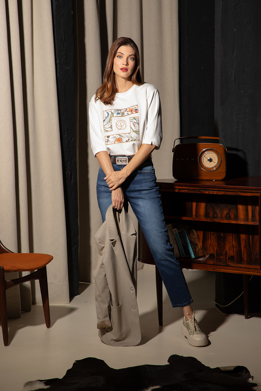 Спортно-елегантни дънки от мек силно еластичен памучен деним в тъмносиньо. Леко свободна кройка с предни и задни джобове, закопчаване с цип и копче. Бродирано лого на задния джоб.