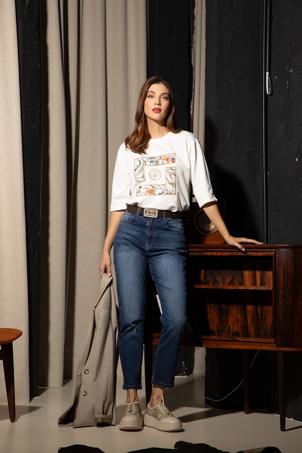 Спортно-елегантни дънки от мек силно еластичен памучен деним в тъмносиньо. Леко свободна кройка с предни и задни джобове, закопчаване с цип и копче. Бродирано лого на задния джоб.